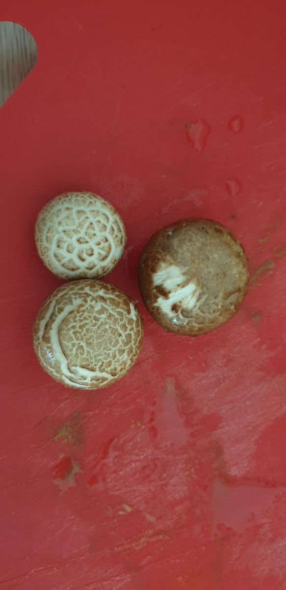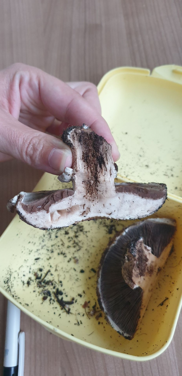 Er riecht nach dem anschneiden genau wie ein Zuchtchampignon, eine kleine Geschmacksprobe ergab, dass er auch genauso schmeckt. Wenn ich etwas Haut vom Stiel abziehe verfÀrbt er sich nicht, wenn ich den Strunk abschneide wird er braun. Die Lamellen sind schön rosa.