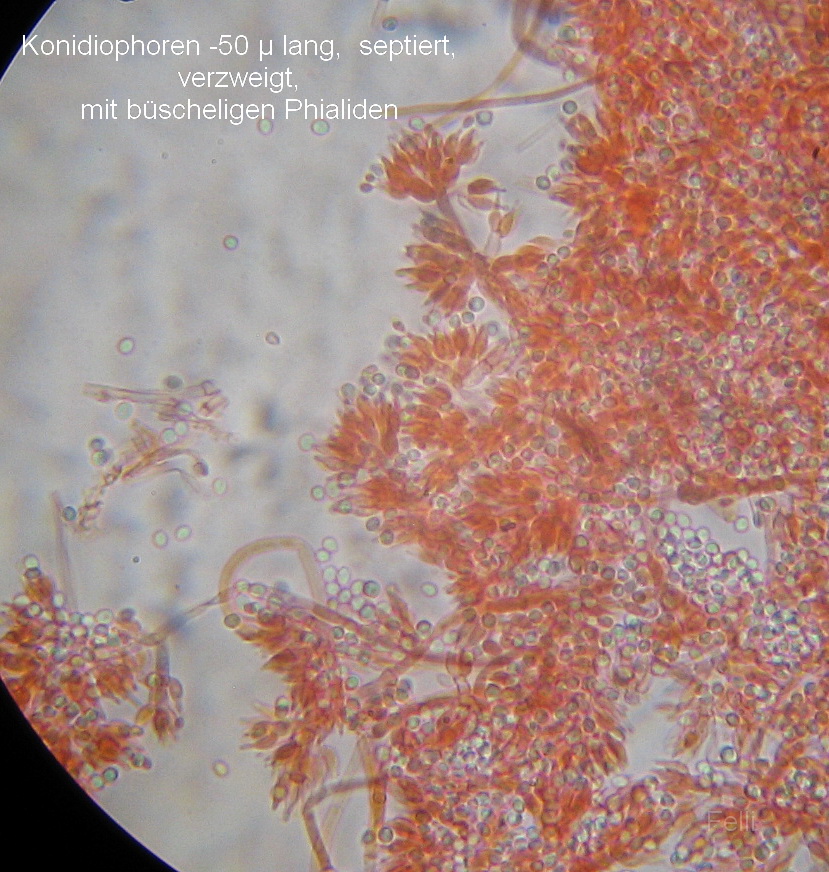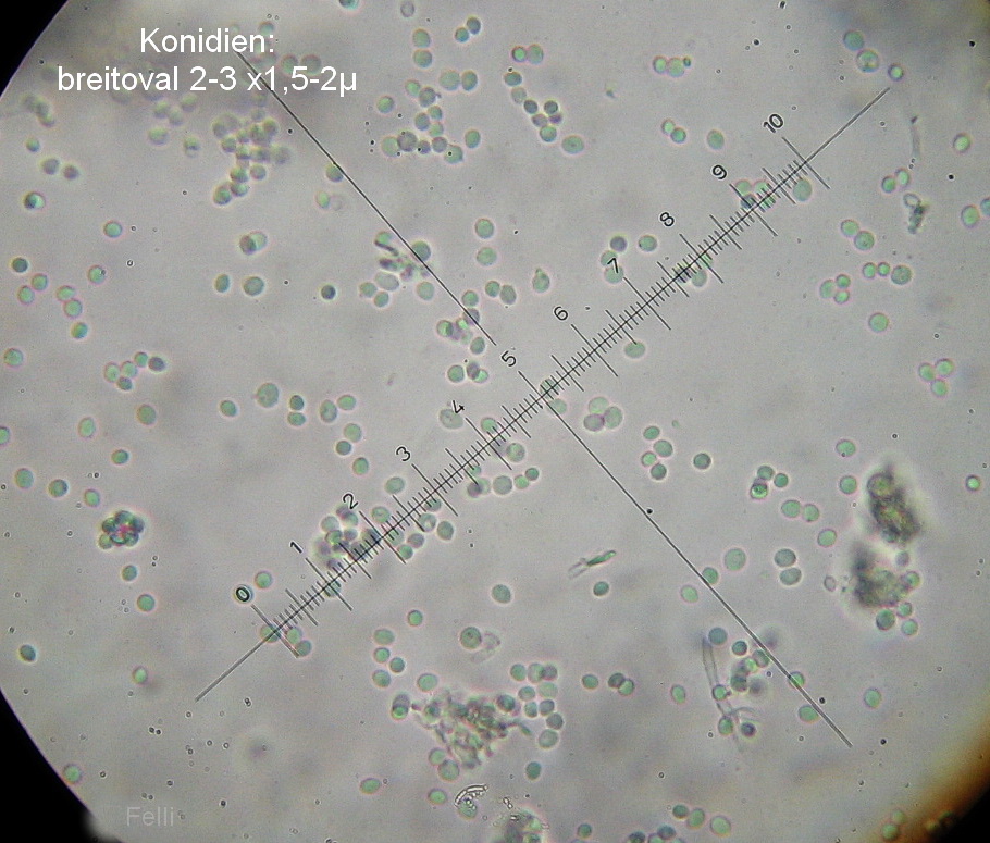 Mikroskopisch gab es 2-3 x1,5-2µ große Konidiensporen,