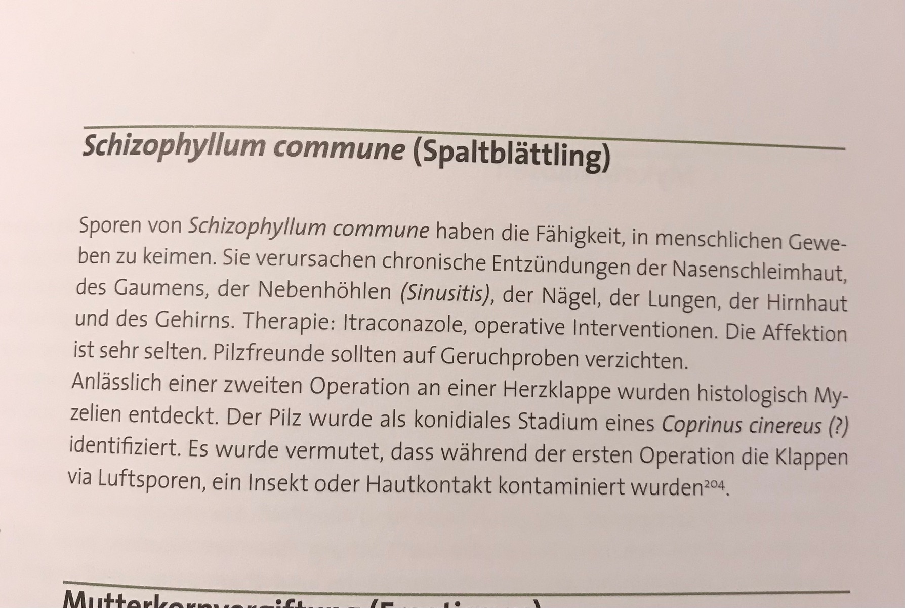 "Die Affektion ist sehr selten. Pilzfreunde sollten auf Geruchproben verzichten. Anlässlich einer zweite Operation an einer Herzklappe wurden histologisch Myzelien entdeckt. Der Pilz wurde als konidiales Stadium eines Coprinus cinerus (?) indentifiziert. Es wurde vermutet, dass während der ersten Operation die Klappen via Luftsporen, ein Insekt oder Hautkontakt kontaminiert wurden".