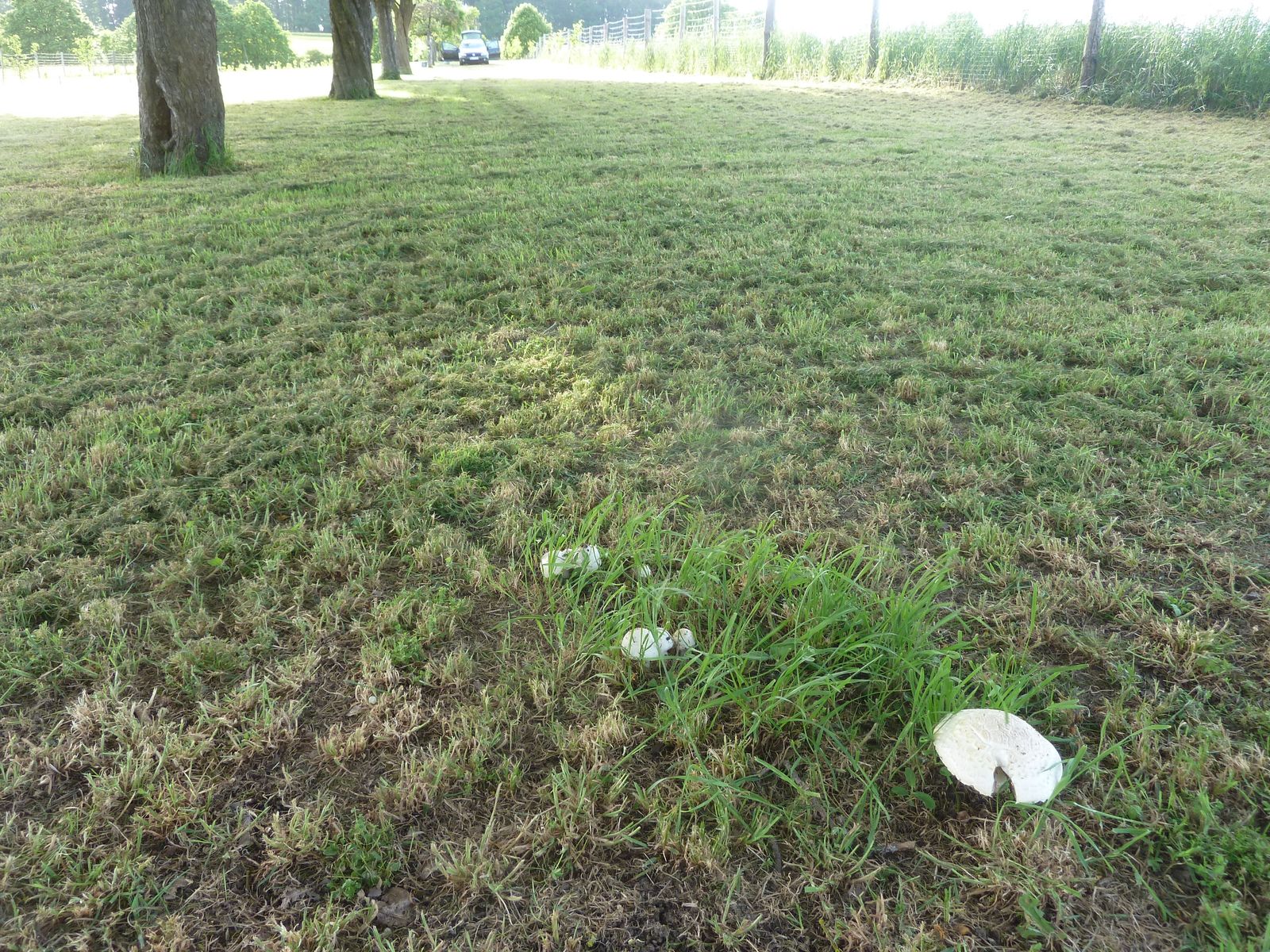 Gerade noch rechtzeitig konnte ich meinen Rasenmäher stoppen, mit dem ich unter einem sehr alten Apfelbaum auf meiner Streuobstwiese unterwegs war. In diesem Bereich hat es reichlich Nährstoffeinträge durch den direkt angrenzenden Acker. Das gefällt den Champignons anscheinend so gut, dass sie schon in der ersten Maihälfte fruktifizieren.