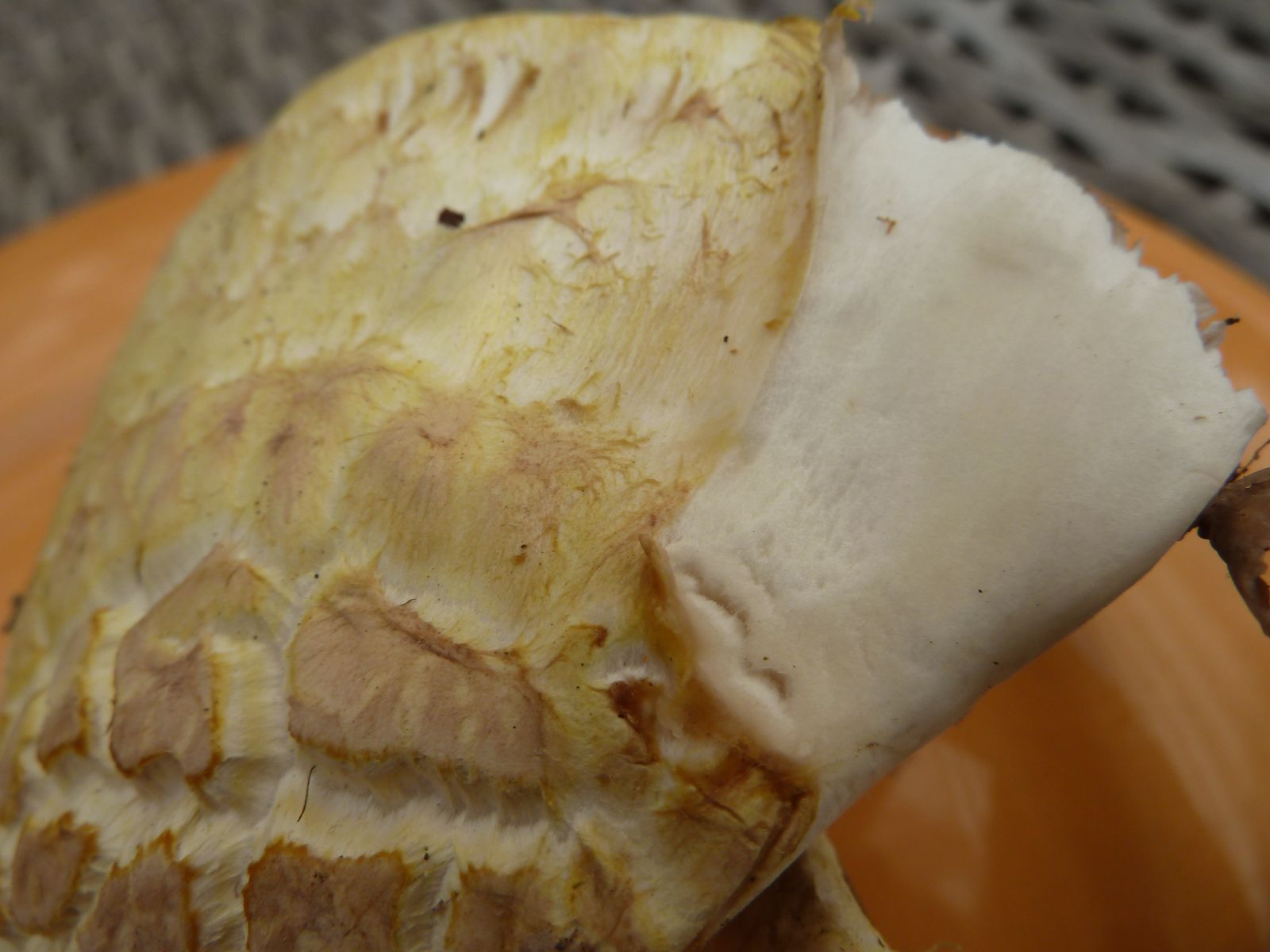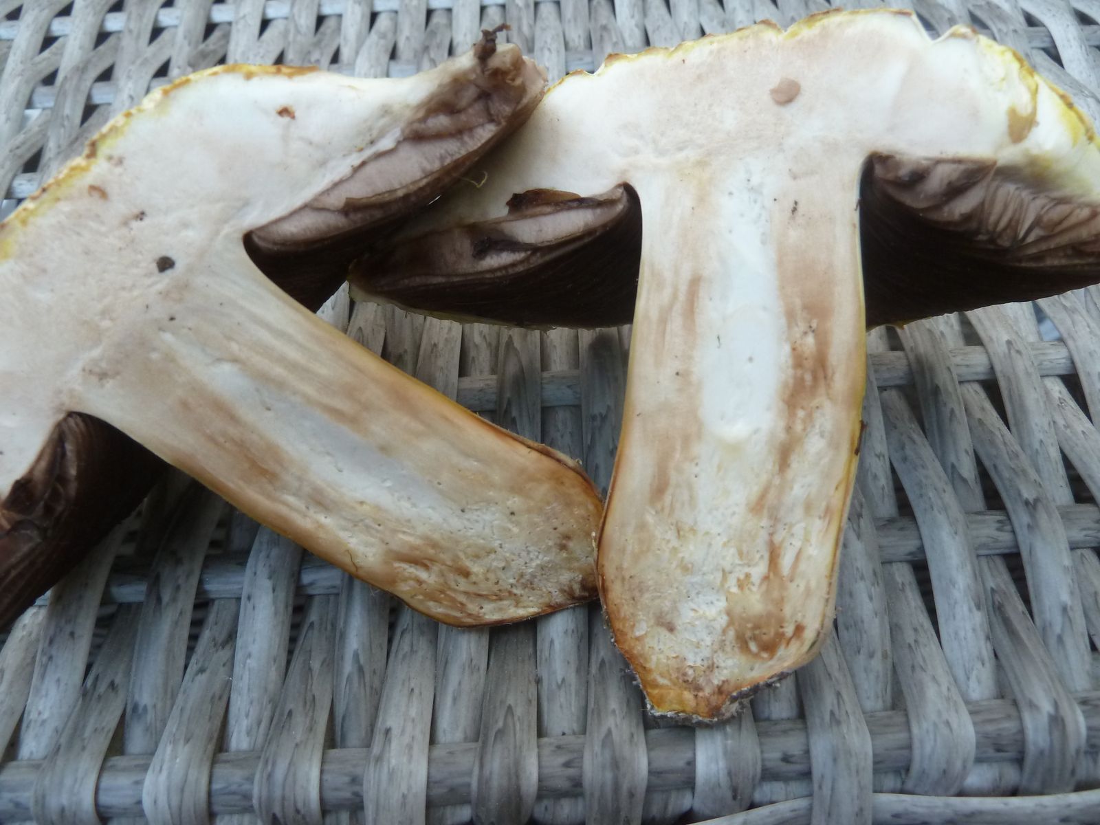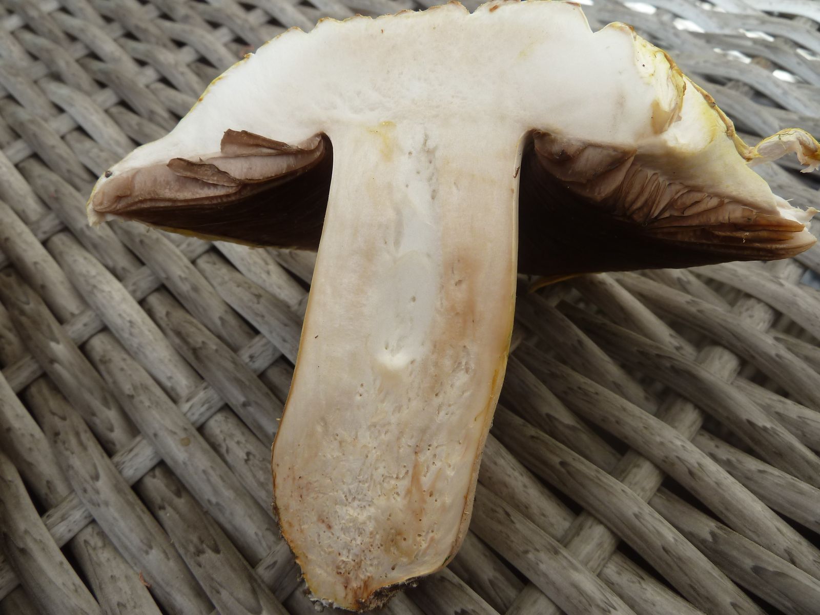 Bei so einem gilbenden Exemplar hätte ich eigentlich einen deutlich süßlichen Geruch erwartet. Allerdings ist der unverletzte Fruchtkörper doch recht geruchsarm und der Längsschnitt gerade eben hat auch zu keinem markanten Geruchserlebnis geführt. Vielleicht ist die Kühlschranklagerung die Ursache? Wenn der Fruchtkörper wieder Raumtemperatur hat, werde ich ihn etwas malträtieren, um ein paar Duftmoleküle herauszukitzeln.