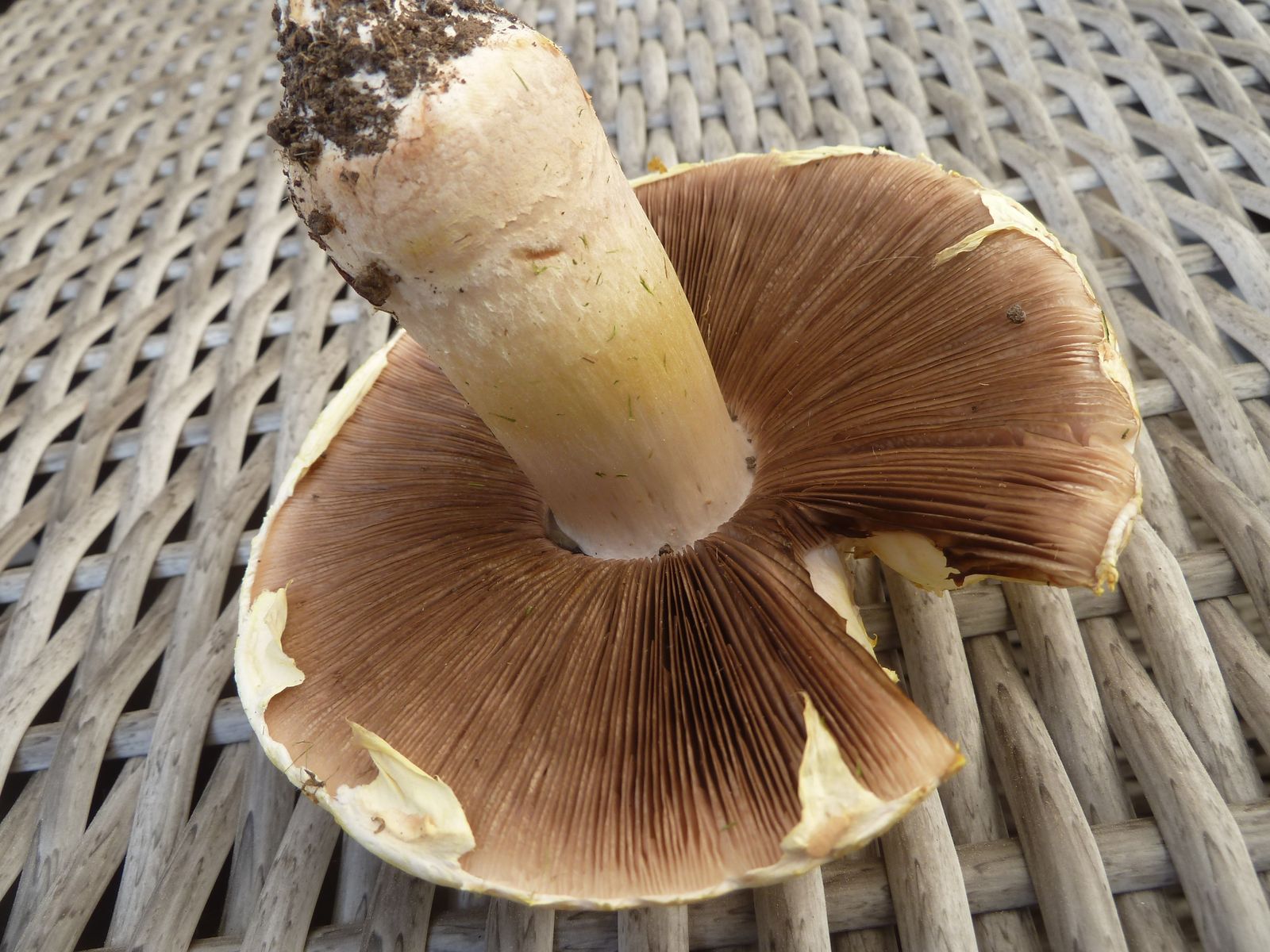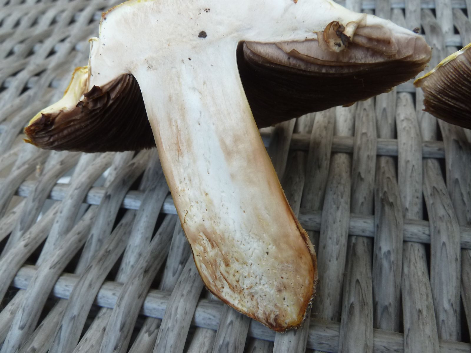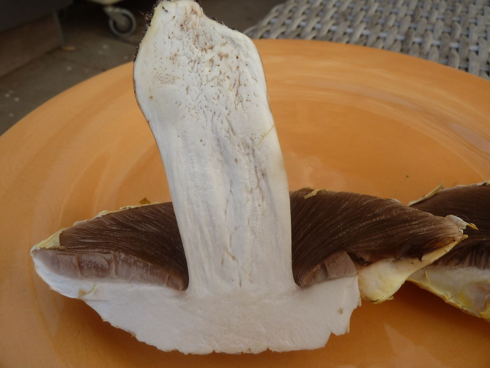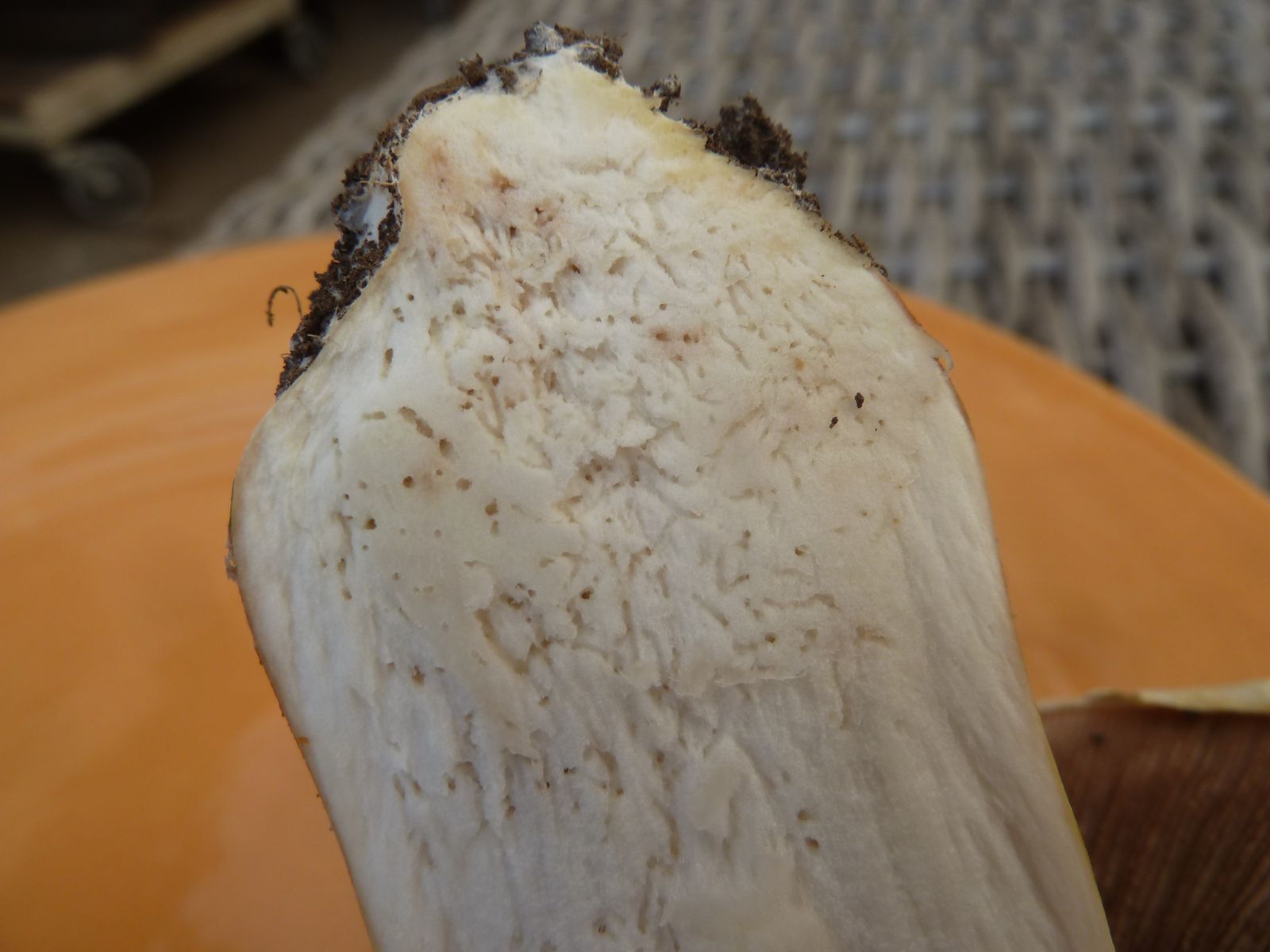 Bei so einem gilbenden Exemplar hätte ich eigentlich einen deutlich süßlichen Geruch erwartet. Allerdings ist der unverletzte Fruchtkörper doch recht geruchsarm und der Längsschnitt gerade eben hat auch zu keinem markanten Geruchserlebnis geführt. Vielleicht ist die Kühlschranklagerung die Ursache? Wenn der Fruchtkörper wieder Raumtemperatur hat, werde ich ihn etwas malträtieren, um ein paar Duftmoleküle herauszukitzeln.