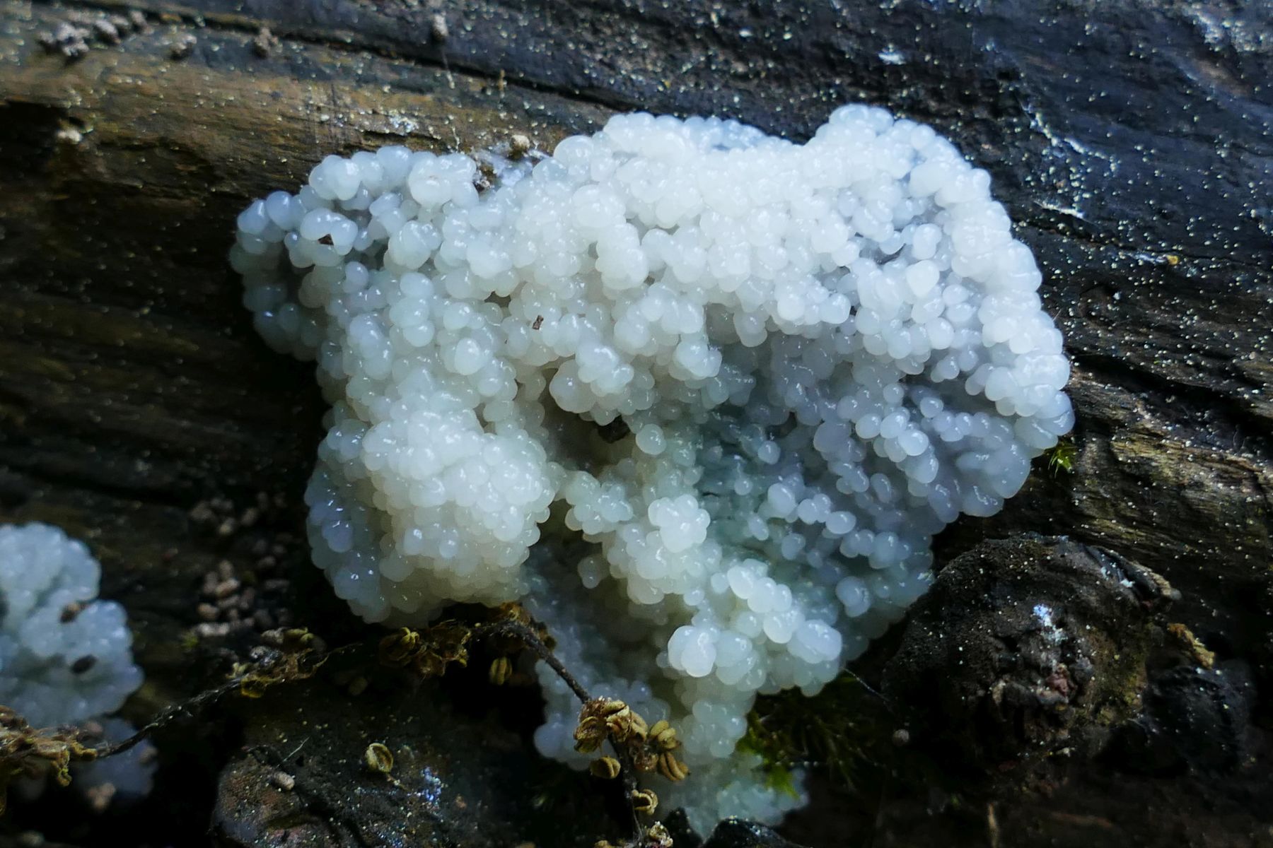 Ein Schleimpilz, der gerade beim Ausbilden seiner Fruchtkörper ist, weich und feucht.