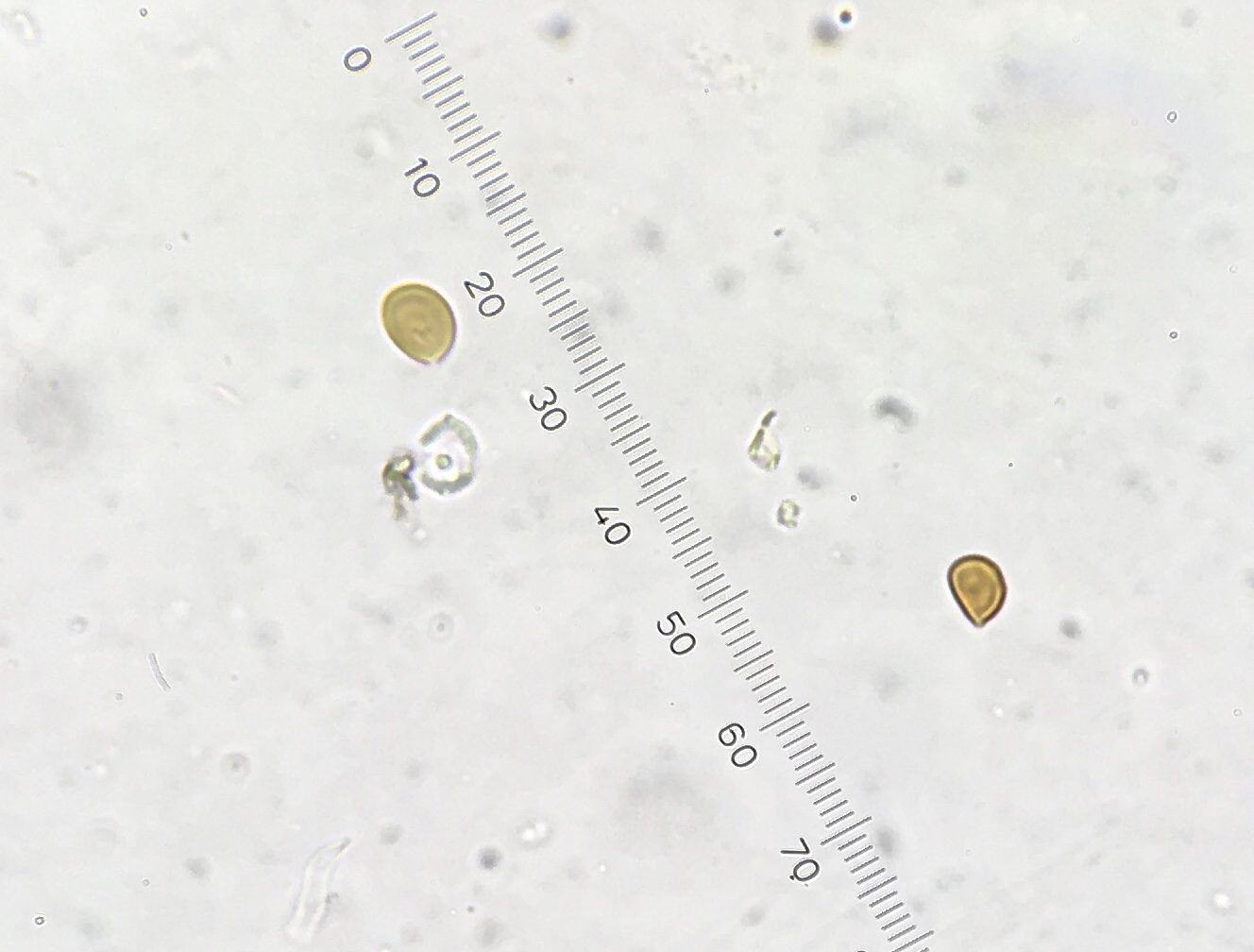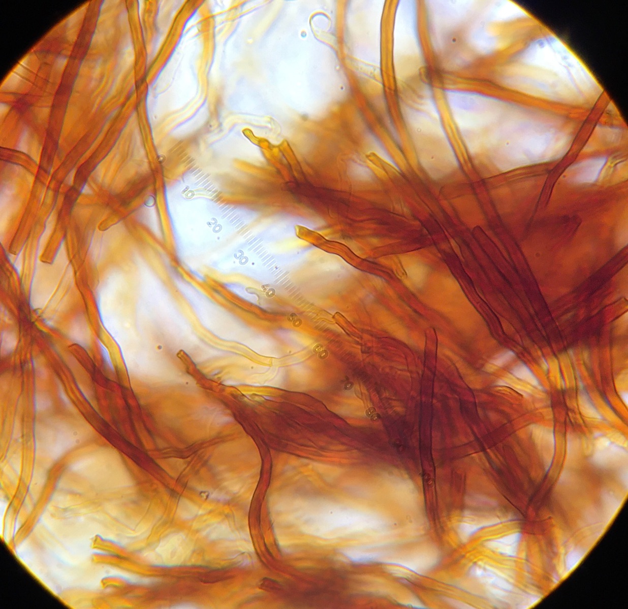 Die Setae messen 50-80 x 8-10. Ich habe in KOH mikroskopiert und manche waren rot, andere gelb gefärbt, die Form ist relativ regelmäßig.