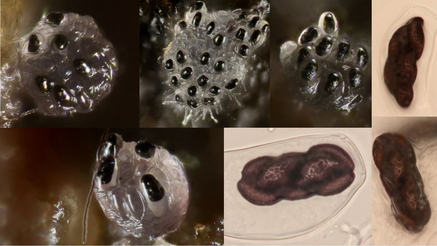 Man könnte wohl an S. versicolor denken, dazu passt aber vielerlei nicht. Insbesondere das Zusammenziehen der Sporen bei Reife ist für S. versicolor unüblich. Auch die extrem dunklen Sporen mit nur einer längs aufreißenden Seite, wo dann vereinzelte Schollen sichtbar werden, lässt eher an was anderes denken.