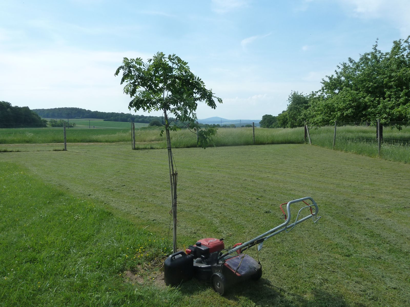 Zum Abschluss noch ein Fernblick auf das Gießener Becken und den Dünsberg am Horizont, im Vordergrund ein Speierling Sorbus domestica nebst meinem Hauptwerkzeug: