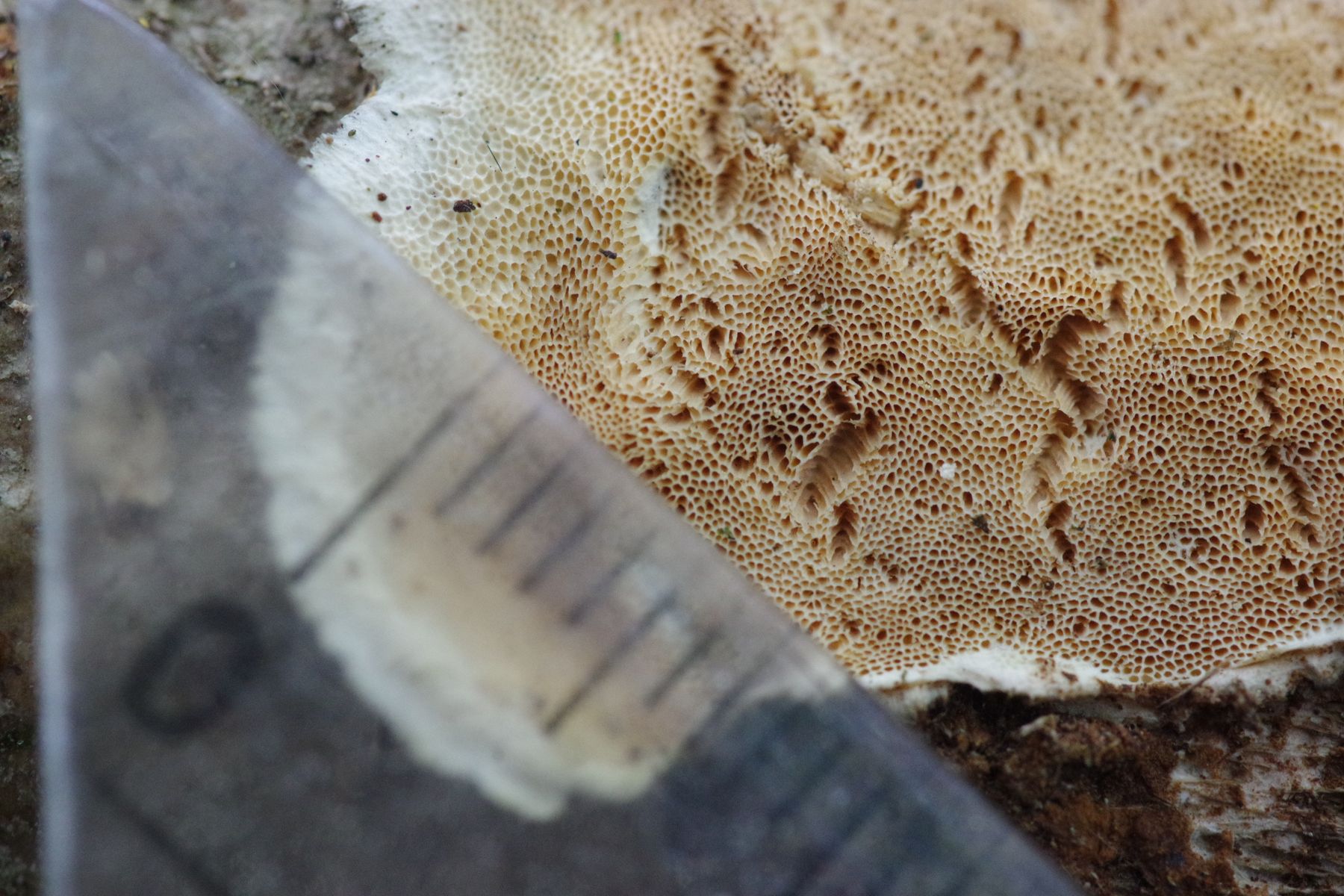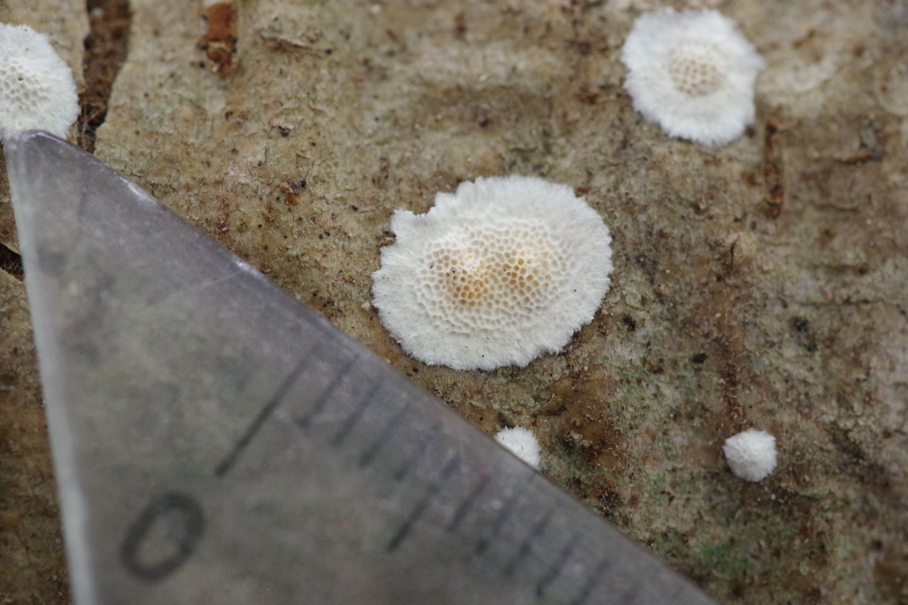 an morschem Totholz von Eberesche auf dem Boden wächst dieser resupinte, dünne Porling. Nur bei größeren Exemplaren ist der Rand leicht abstehend, dann oberseitig weiß. J. nitida soll hier eine häufige Art sein.