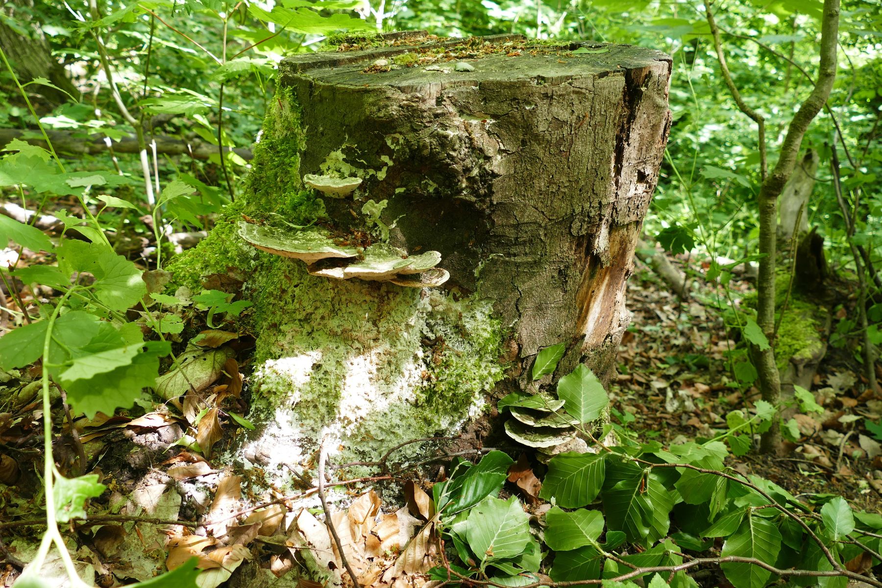 Bild 1 Baumstubben mit Trameten und weißer Kruste auf Moos