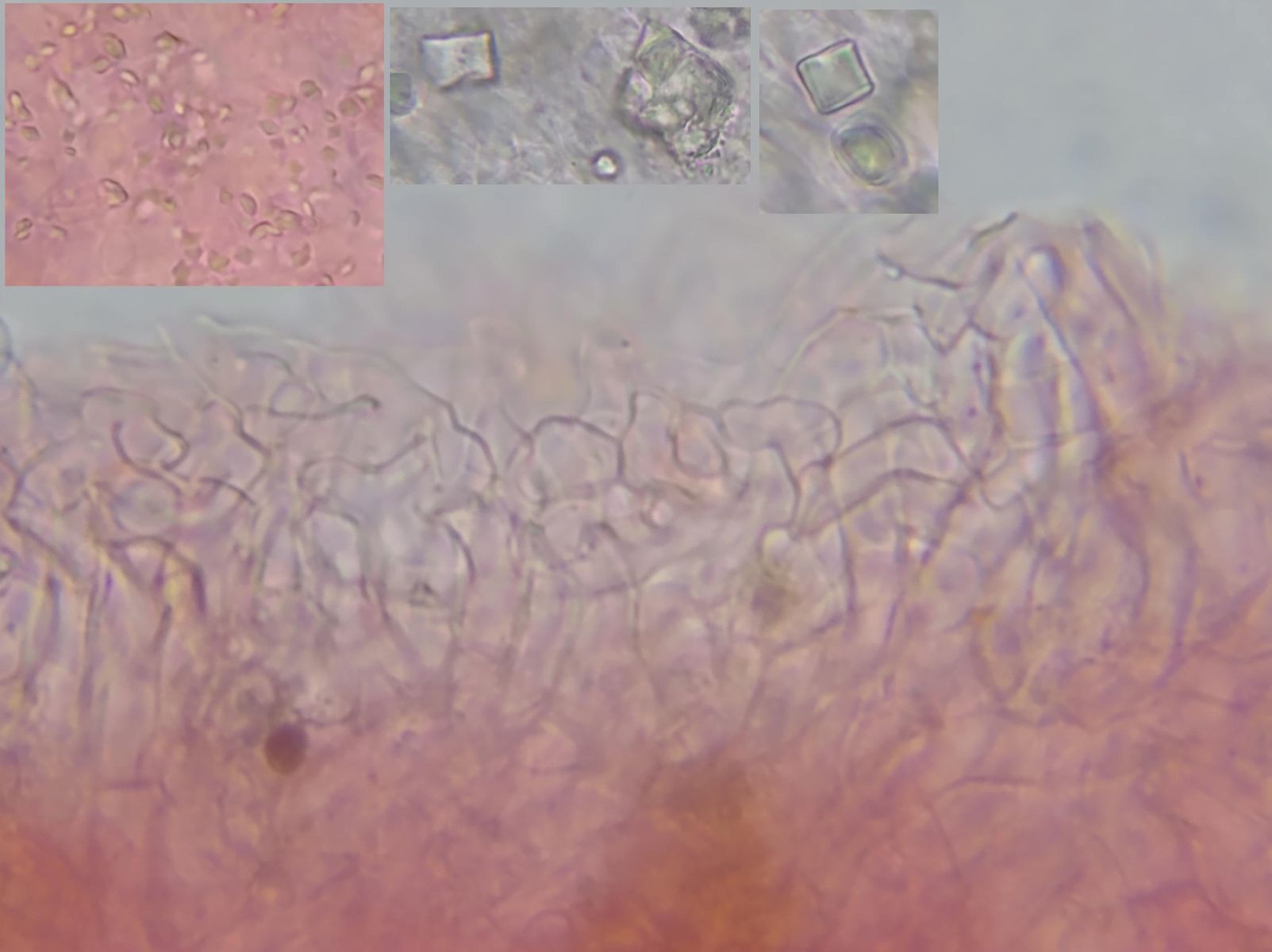 Das Subhymenium ist dicht gepackt und enthält zudem eine wachsartige Matrix mit (Oxalat-)Kristallen.