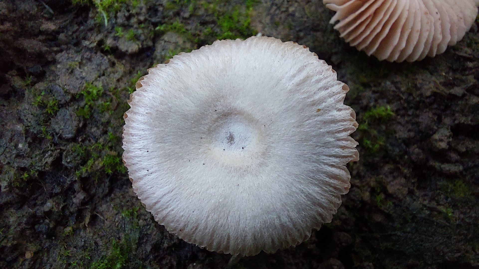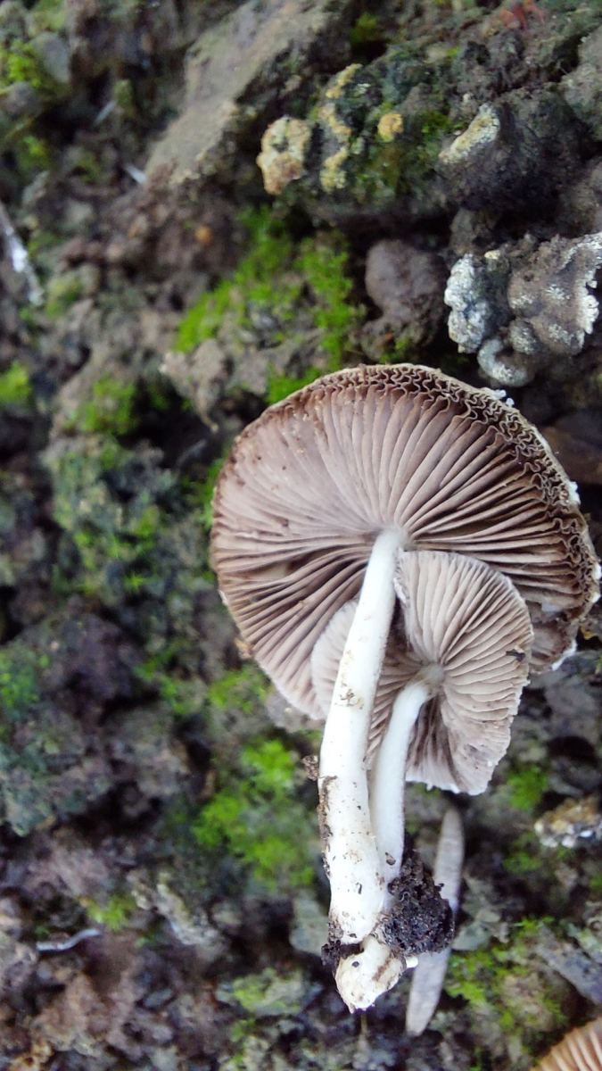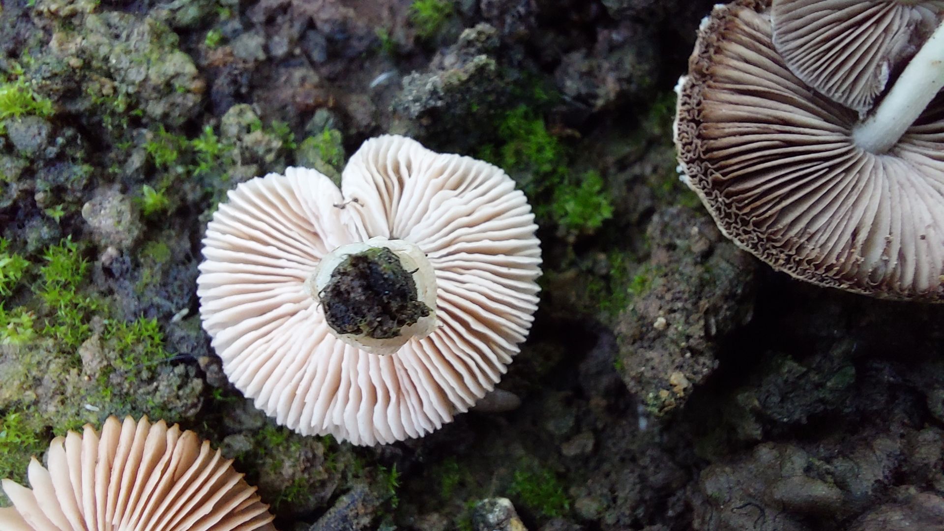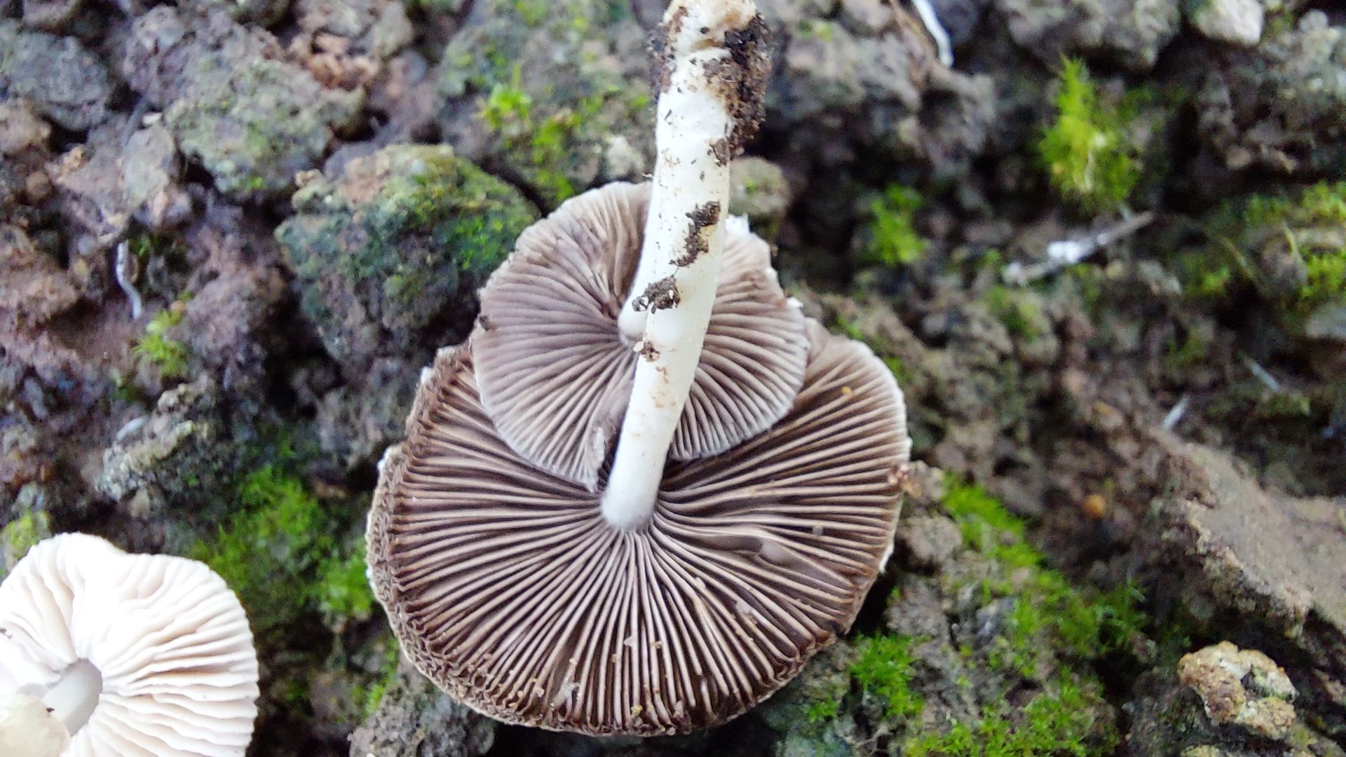 Die Pilze haben auch eine ausgeprägte Volva, wie man auf Bild Nr. 7 sieht. Der umgedrehte Doppel-Pilzkörper (Bild Nr. 8) mit dem etwas eingetrockneten Rand und den bereits recht dunklen Lamellen (durch die dunkle Sporenfarbe) wuchs vorm Gewächshaus beim Paprika und könnte ggf. auch eine eigene Art sein.
