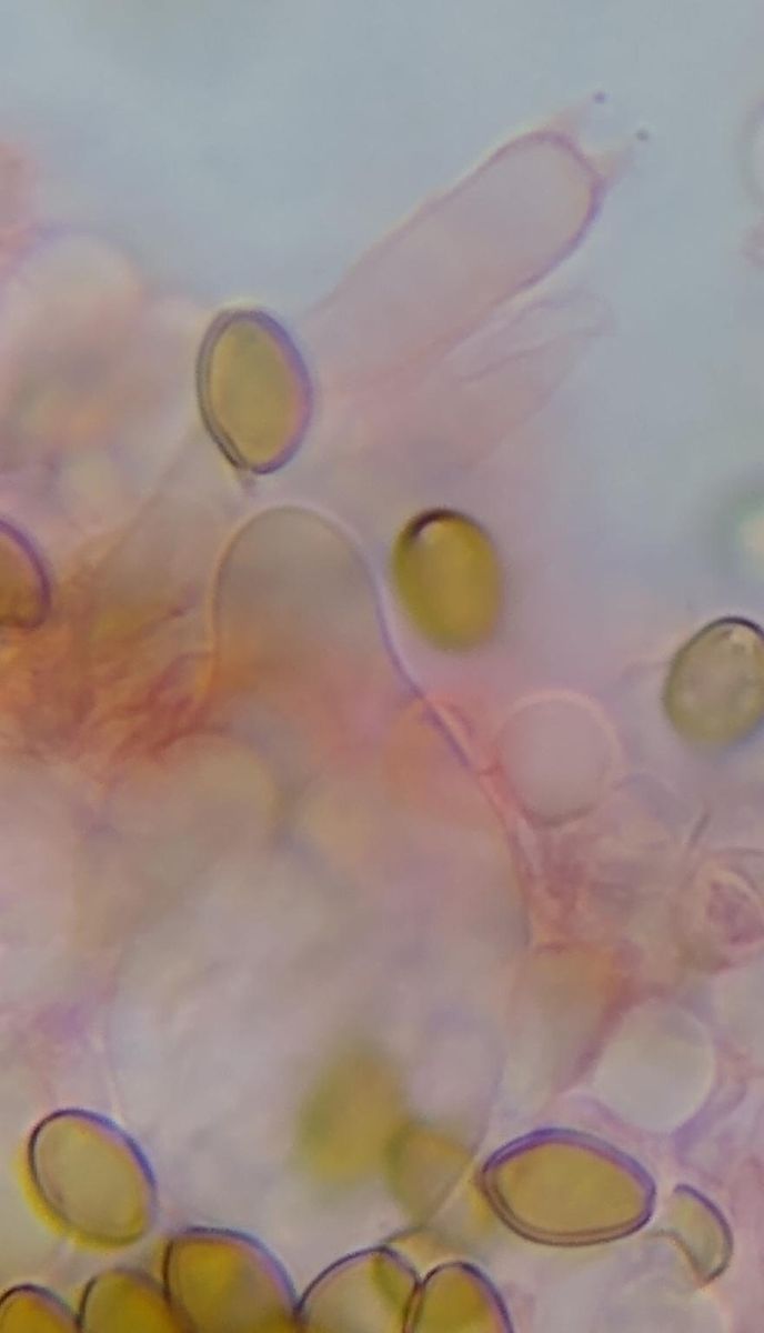 Die Sporen sind braun (wie meine Finger), glatt-dickwandig, ohne Ornament, inamyloid, aber ev. mit einem Keimporus.