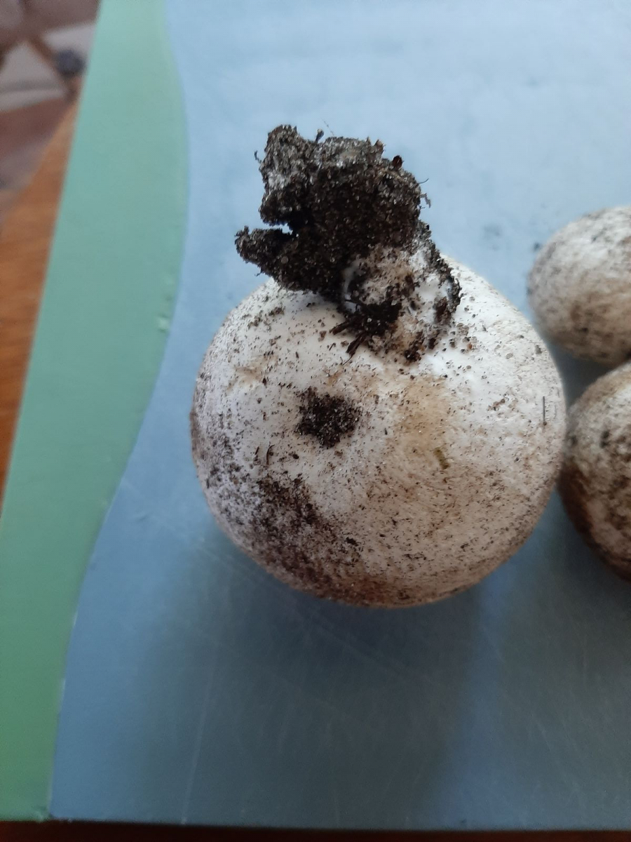 Der Pilz ist kugelförmig und war beim herausnehmen reinweiß, ca 7 cm Durchmesser. Geruch angenehm aber schwer zu beschreiben. Nach dem aufschneiden intensiver, fast etwas nach Gorgonzola. Kleiner wurzelartiger Ansatz.