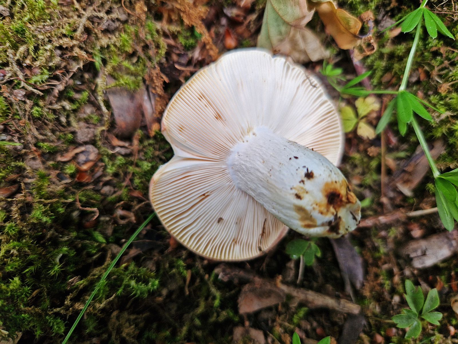 Lamellen brüchig, wenn man Sie etwas bittet (ausgetrocknet?), wirken im Sonnenlicht eher cremefarben, blass gelblich, jedenfalls vom weißen Stiel farblich abgesetzt.