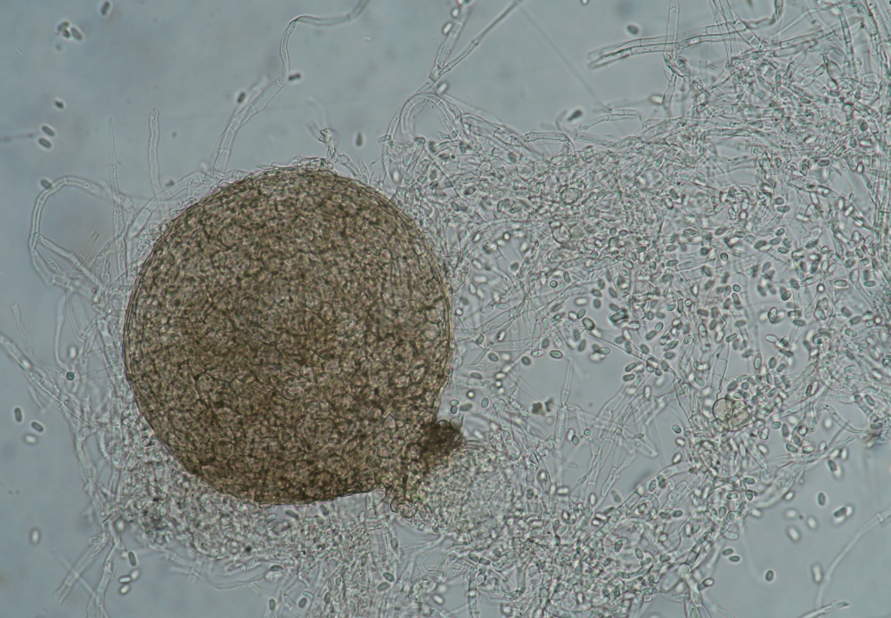 Hi, I wonder if there are people in this forum that are interested in moulds in general. When the summer is to hot for macrofungi, I often switch to moulds. Here I isolated (hopefully in pure form) a mould that is white-cream superficially, without any arieal conidiophores, but forming numerous blackish-brown perithecia (?) or globular structure, 100-200 um across, which give rise to conidia-? asco-? spores. These are cylindrical with obstuse rounded ends, sometimes slightly bent, 8 um approx. I wonder if it is or related to Colletrichium. The colonies look pure (I have some 4 isolates) but under the microscope there seems to be two types of mycelium (!!!).
