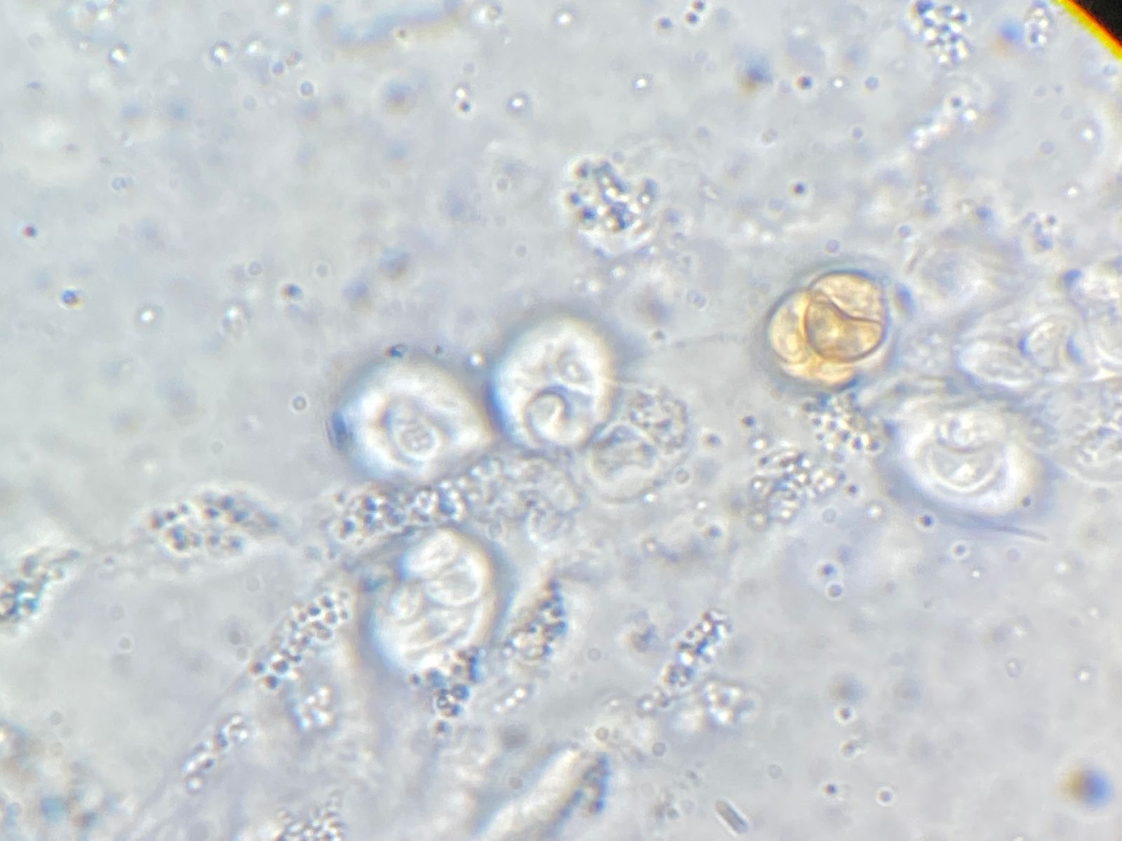 ebenfalls auf Gänsedung hat sich ein Pilz entwickelt, der kleine schwarze Perithecien ohne ausgeprägten Hals, aber mit erkennbarer Mündung bildet. Mikroskopisch lassen sich kleine rundliche Asci finden (9 - 11 x 7,5 - 8,2 µm), die wiederum anfänglich hyaline, später über gelblich bis bräunlich reifende Sporen beinhalten. Diese messen 5 - 6 x 2,5 - 3,2 µm. Von meiner bescheidenen Literatur ausgehend würde ich den Fund irgendwo rund um die Gattung Microascus verorten . Leider fehlt mir hier die Erfahrung und in meiner Literatur sind meist nur klinische Isolate mit Merkmalen aus der Kultivierung beschrieben. Vielleicht hat doch jemand von euch eine gute Idee dazu?