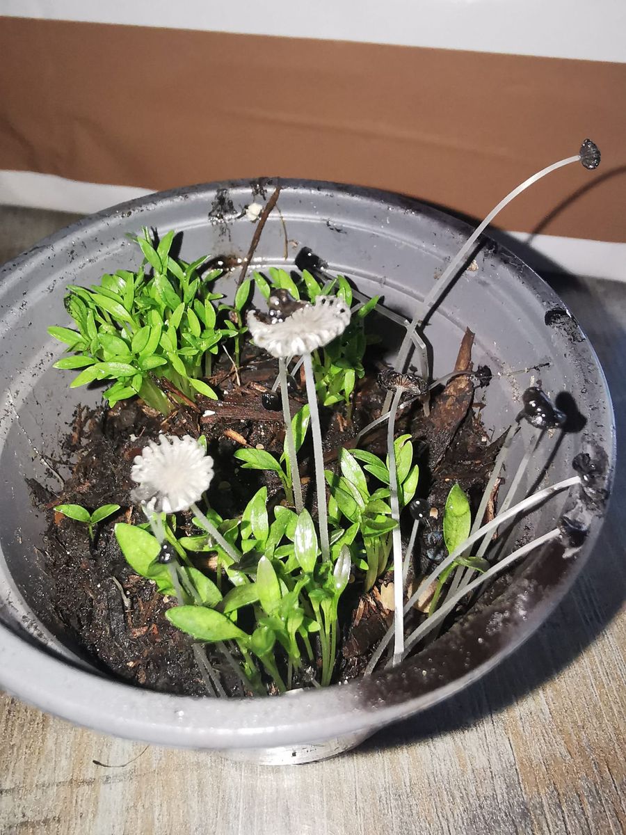 Umpotten ins große Gewächshaus wird nix nützen. Als Pilze nehmen die meisten Leute lediglich deren Fruchtkörper wahr, der "eigentliche Pilz" ist ein feines Gewebe im Substrat. In deinem Fall in einem Blumentopf, gefüllt mit Erde.