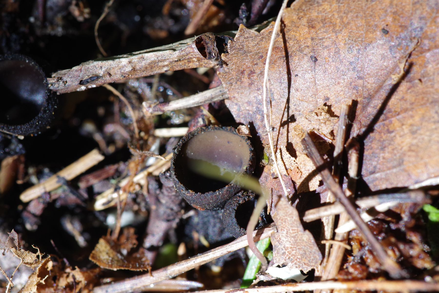 Zum Vergleich: von Pseudoplectania nigrella sind die letzten Becher noch schrumplig zu erkennen - im Vergleich dazu ist der heutige Becher aber eher nicht direkt auf Sand sondern in einer dicken Schicht Spreu (wodrunter aber auch Kies ist) und es ist deutlich dunkler. Plectania melastoma ist derzeit in Höchstform, aber der ist ja eindeutig auf Holzsubstrat. Hier bin ich mir nicht ganz sicher, worauf der genau wächst. Sieht aus wie ein durchwurzelter Sandklumpen.