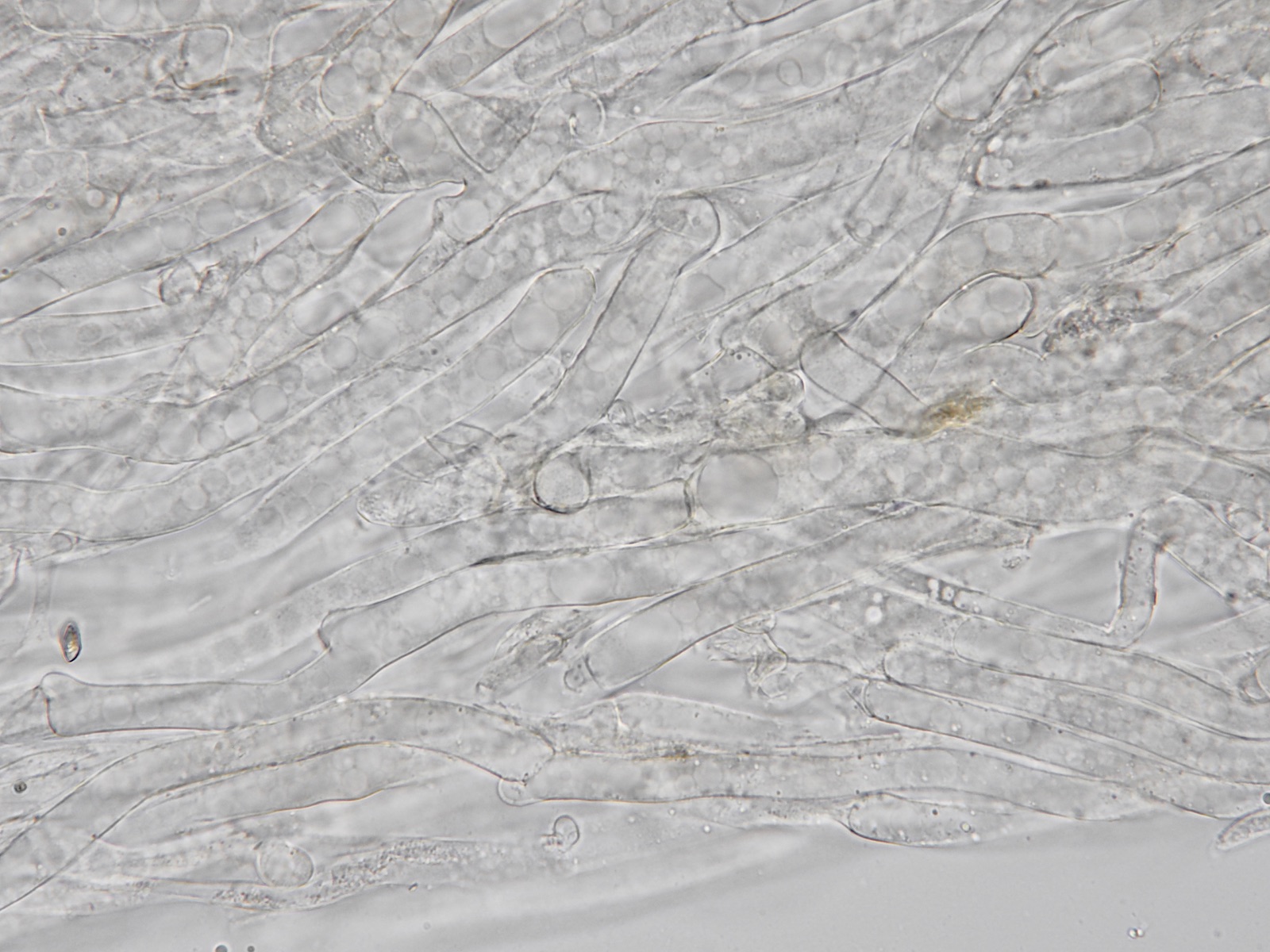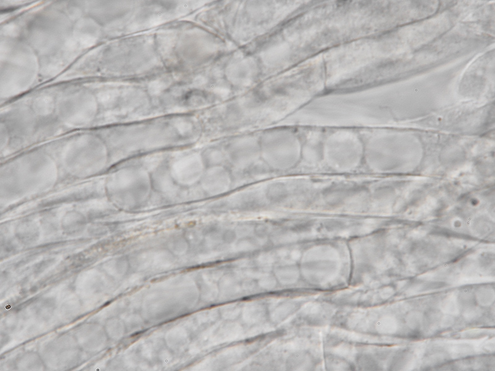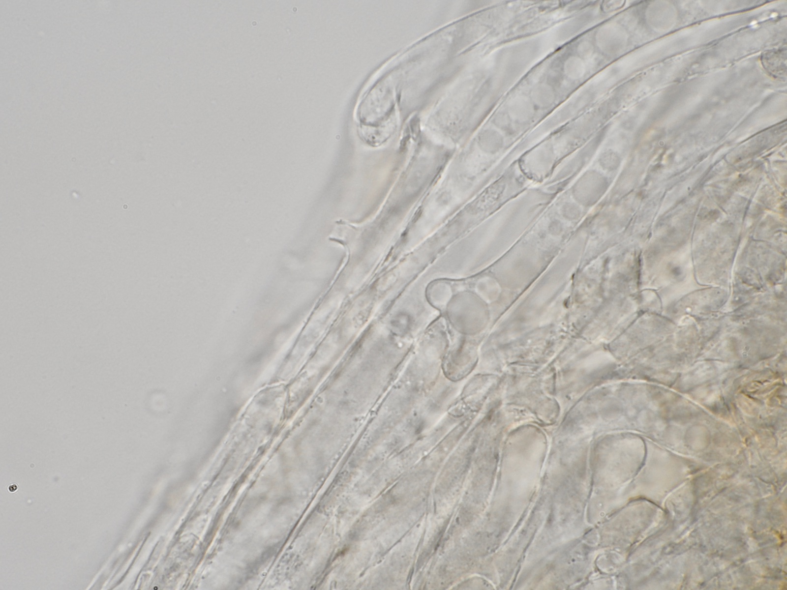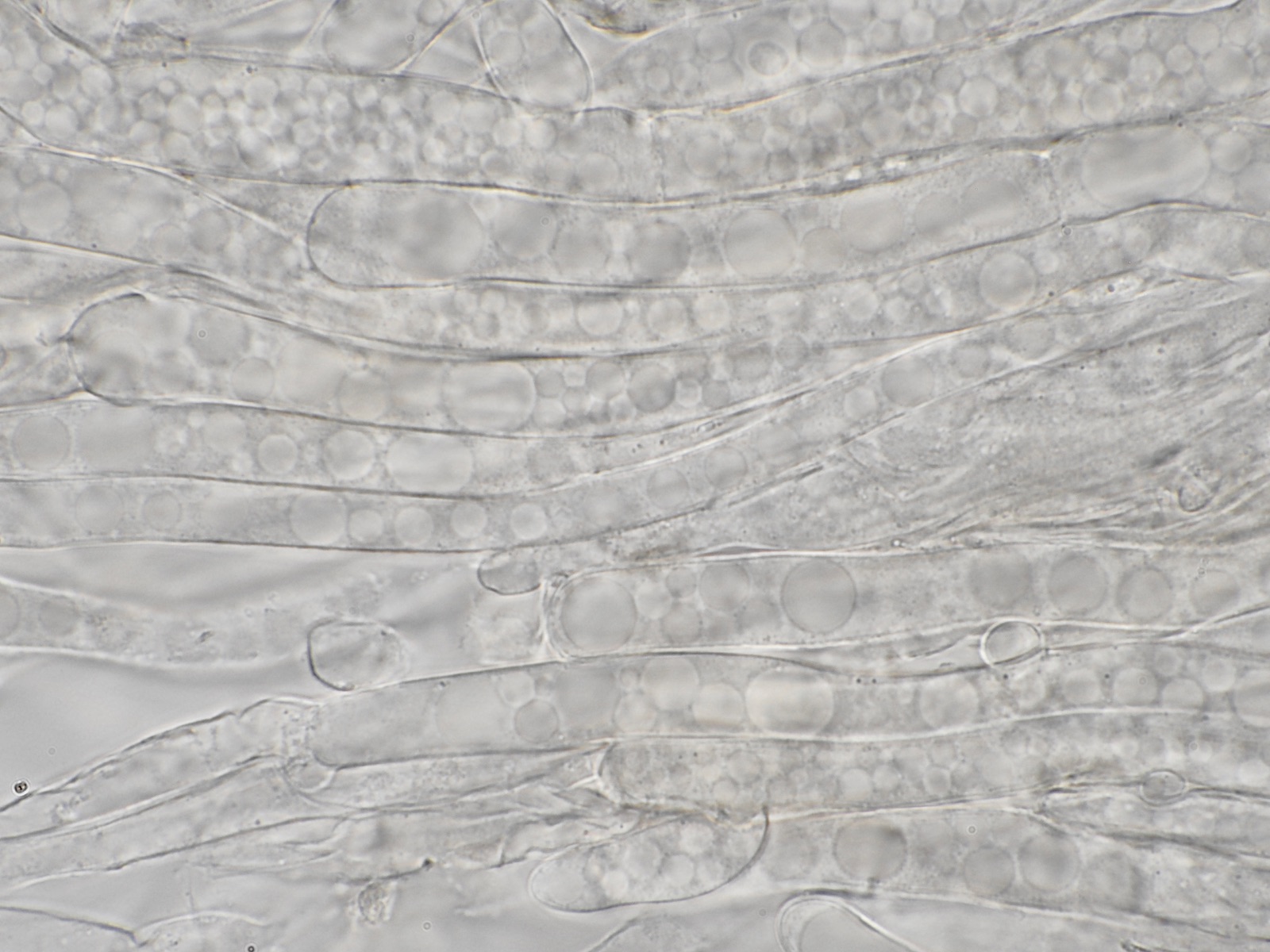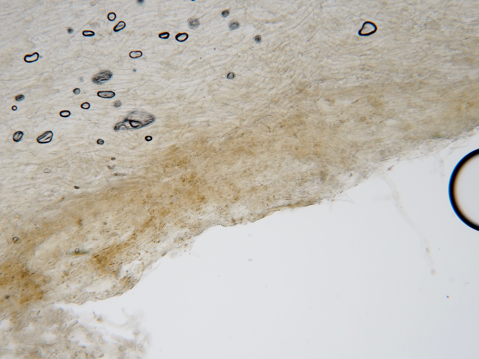 HDS mit parallel liegenden Hyphen, einige Schnallen, hellbraune Pigmente, keine Inkrustationen entdeckt, aber in den Hyphen runde Gebilde, die wie Blasen aussehen