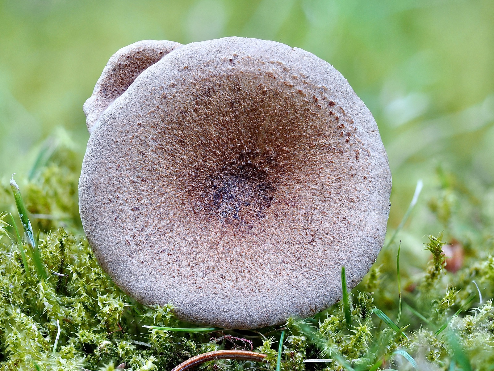 Hut: braun, Huthaut glänzend/seidig, in der Mitte und auch leicht am Hutrand kleine braune Schuppen, trichterförmig, keine Riefung am Hutrand