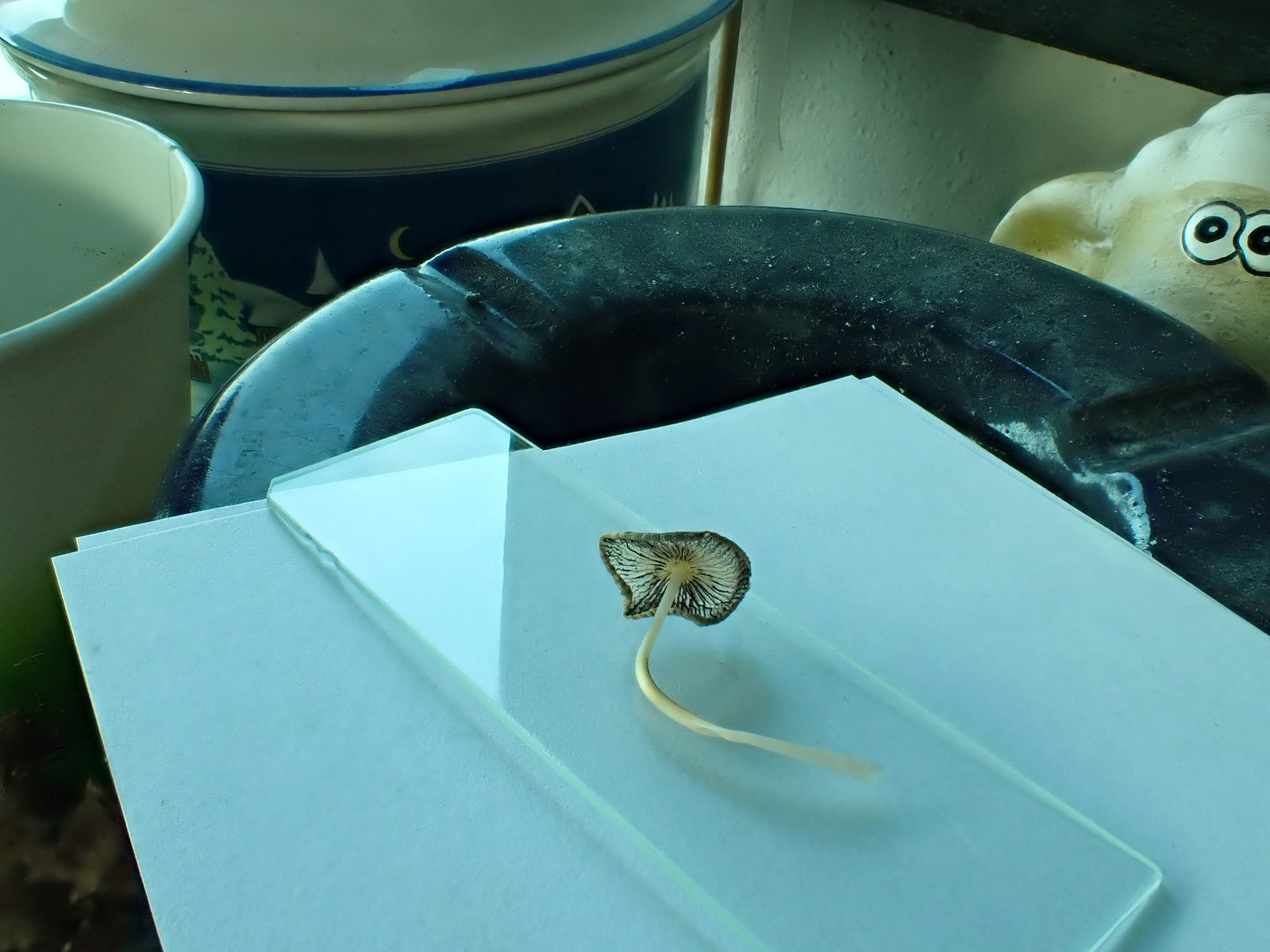 "Morgens da, Abends weg", Pech gehabt. Erst nach drei Tagen habe ich überrissen, dass der Pilz weiter FK entwickelt, die vorangegangen klebten als 'Schatten' noch am Blumentopf,