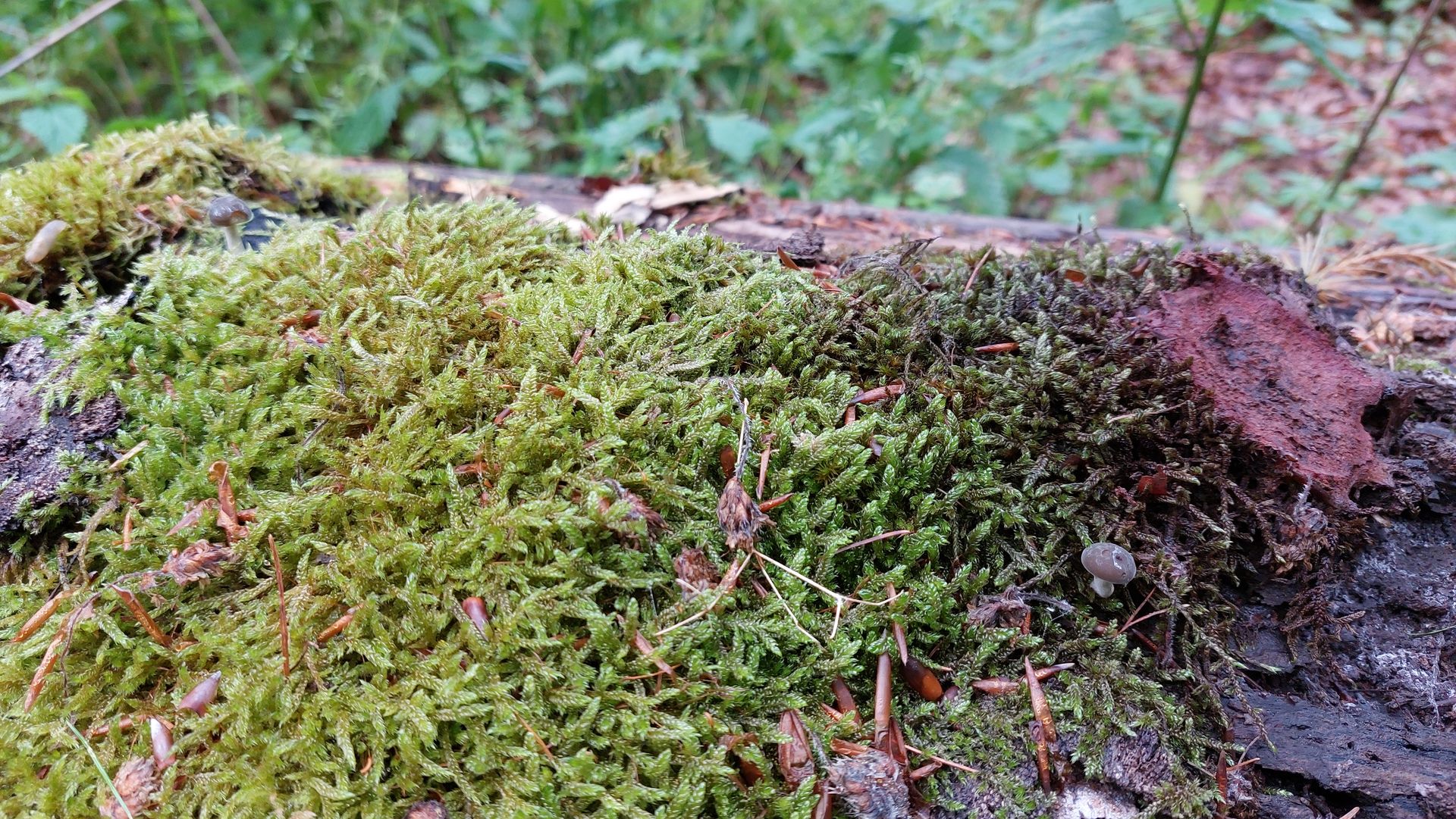Kleine Pilze mit dunkelbraunem Hut an dickem Buchenstamm