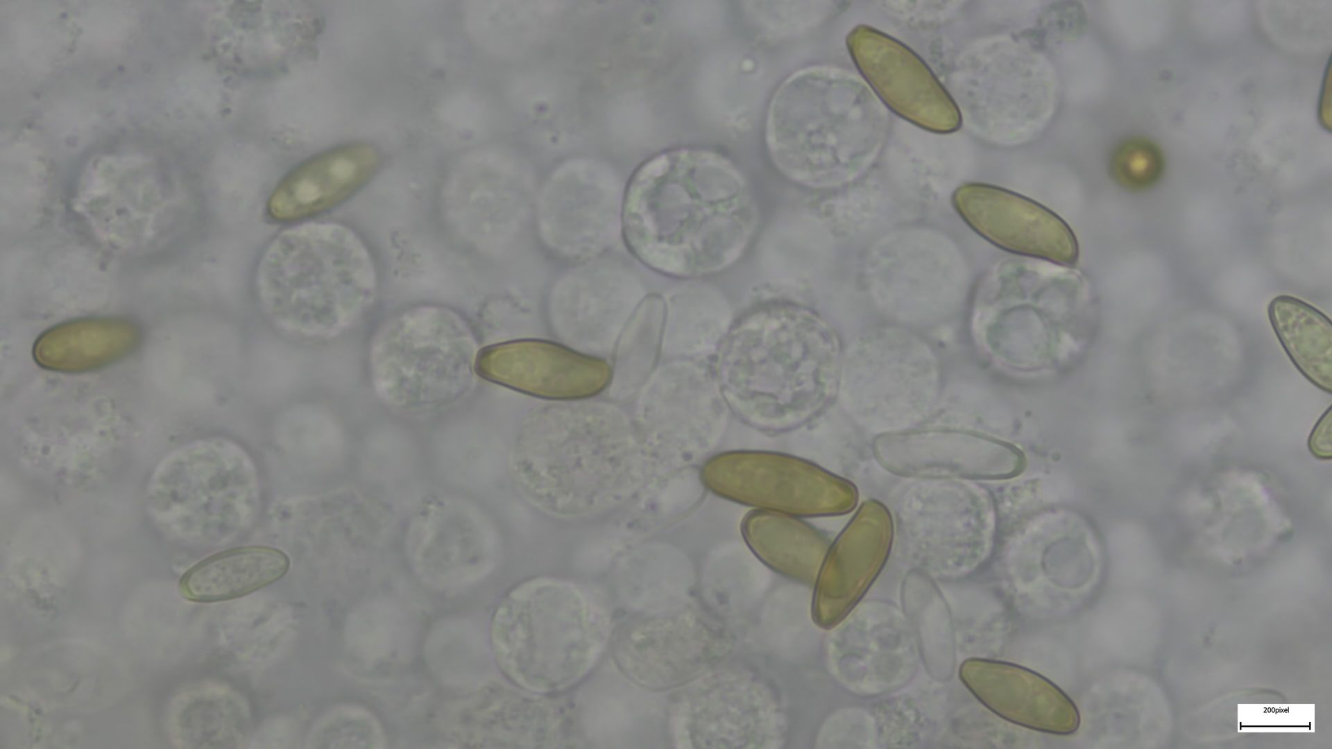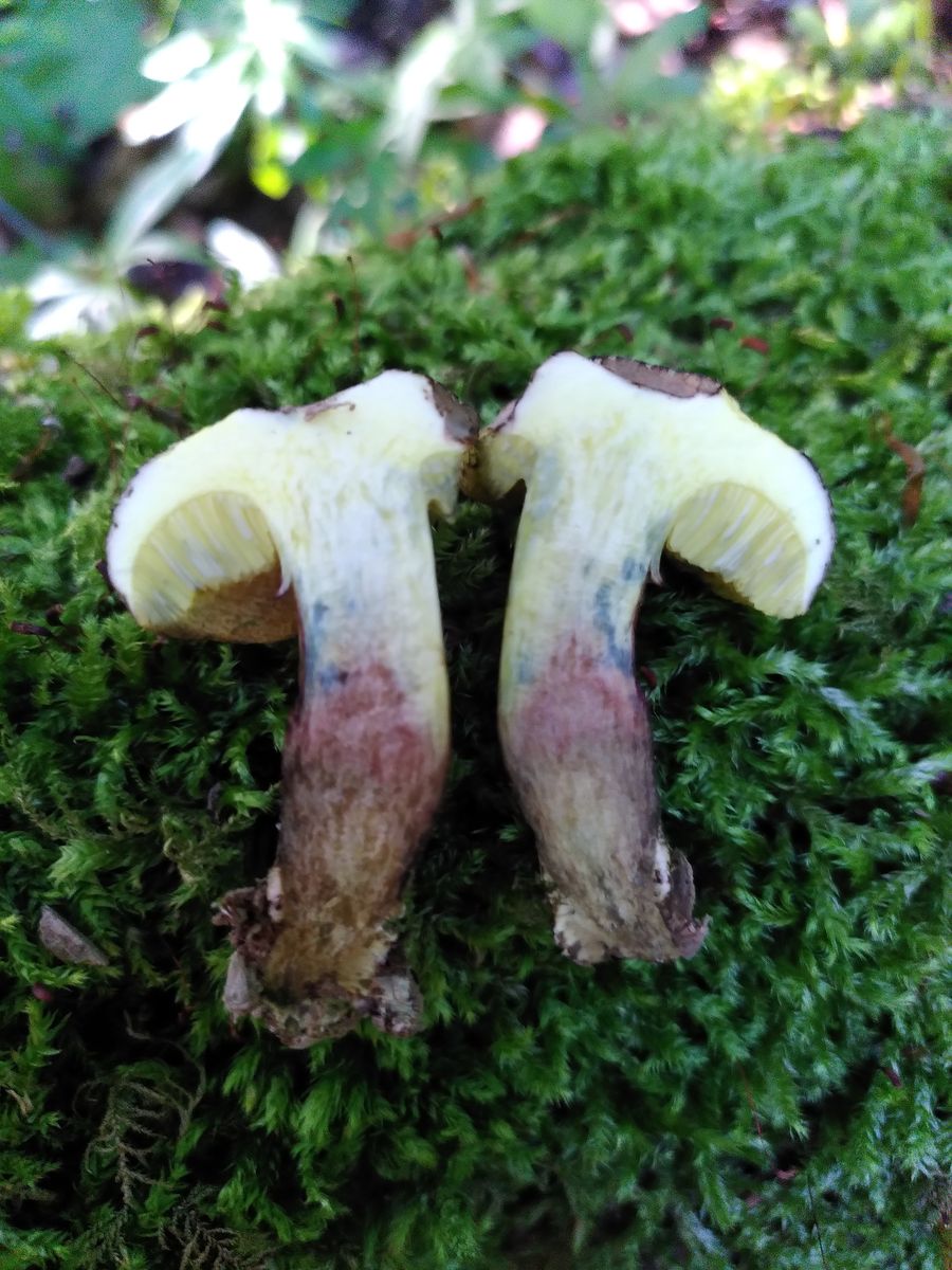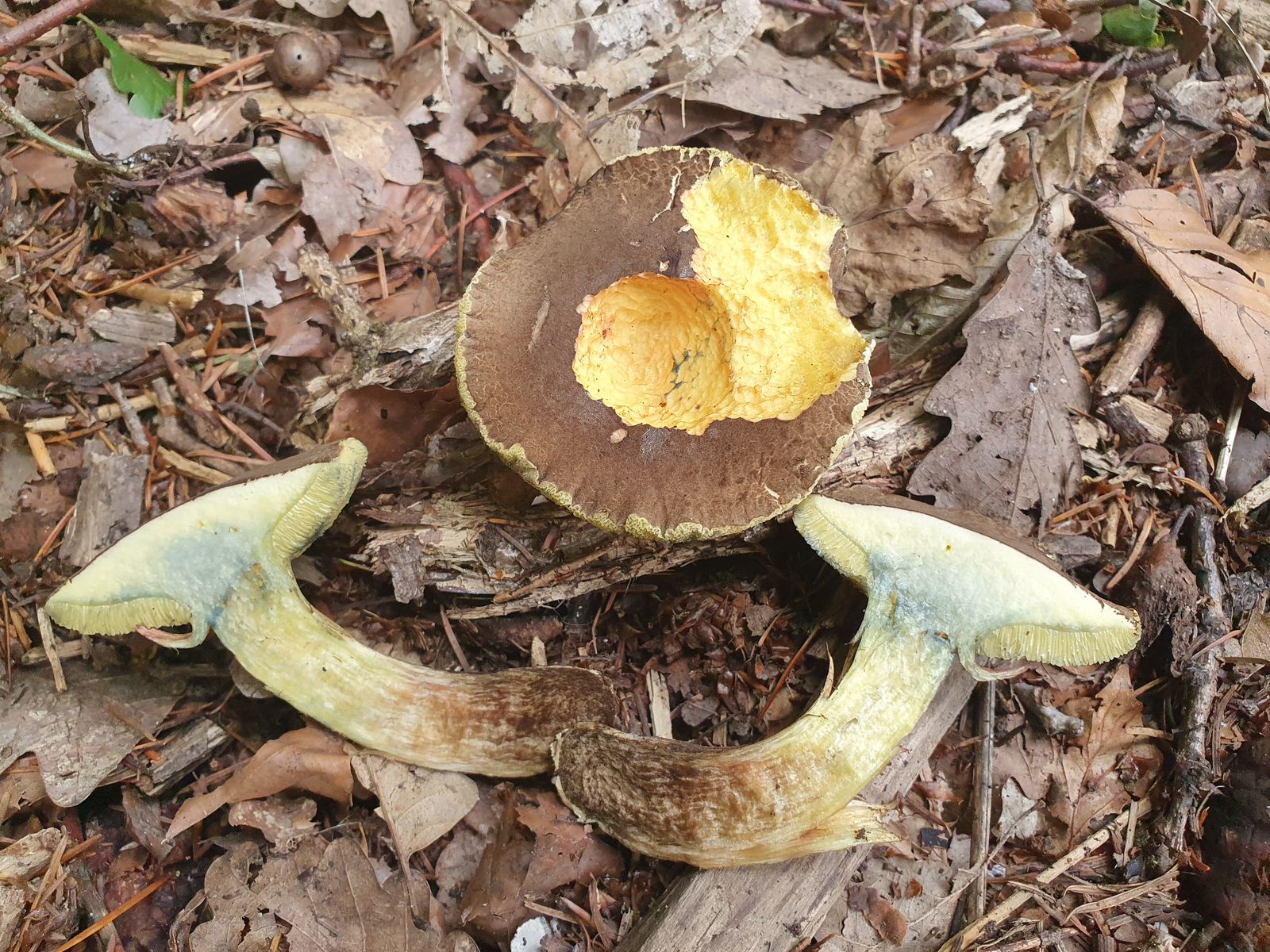 Poren: Gelb mit gelben Porenmündungen, bei Druck deutlich blauend, xerocomoid, ergo beim Auseinanderziehen teilweise der Länge nach einreißend.