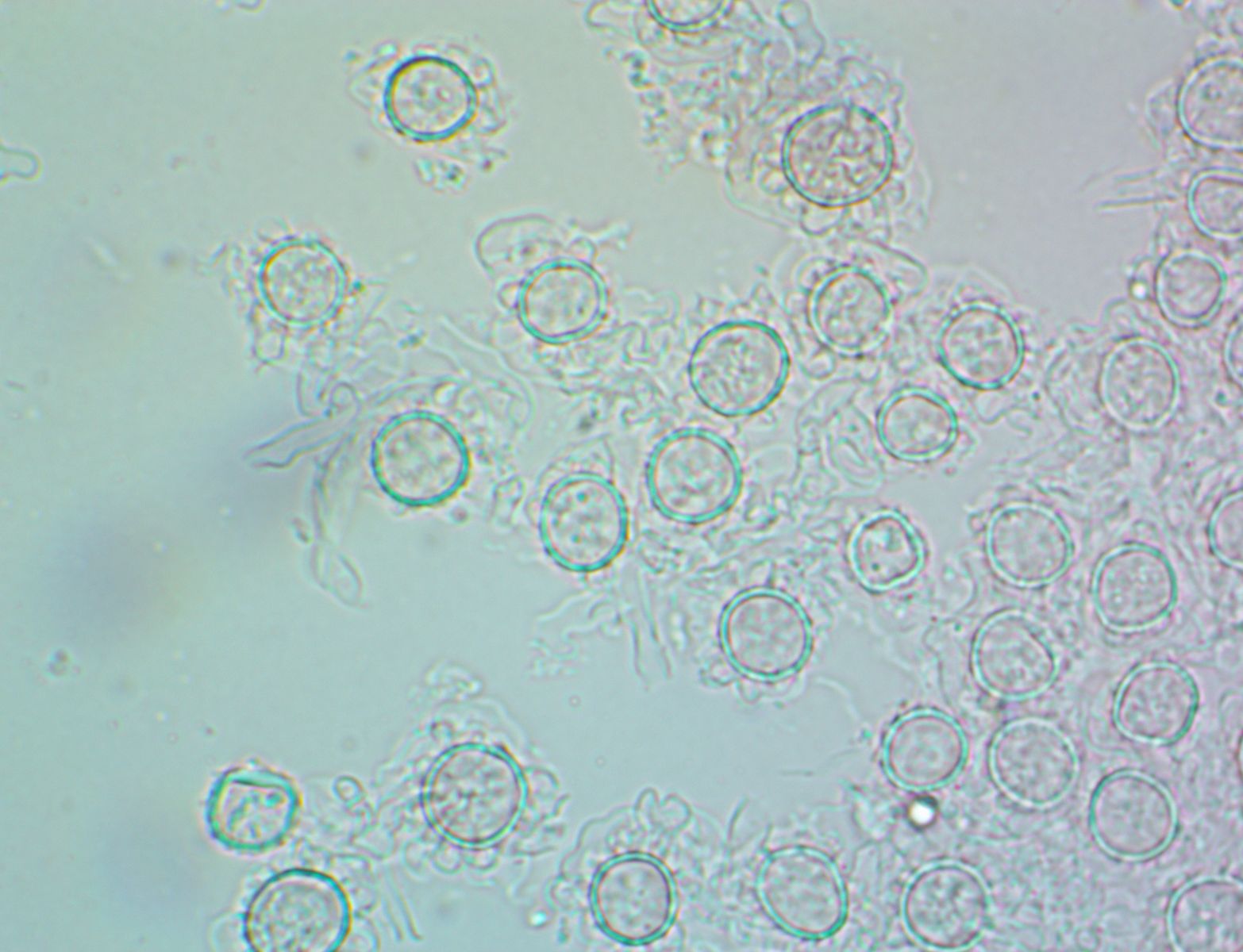 Zu guter letzt: Ich habe auch ein Quetschpräparat aus dem unreiferen FK in etwa aus dem violetten Teil der Gleba erstellt. Zu meiner Verwunderung waren die Sporen dort in Wasser völlig hyalin: