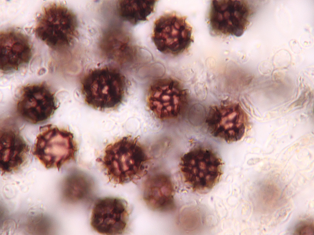 Wenn ich das Ornament jetzt mal ganz unbefangen als netzartig interpretiere, kommt danach eigentlich nur Scleroderma bovista in Frage. Da ich mikroskopisch aber noch recht am Anfrag stehe, bin ich mir nicht sicher, ob das nicht nur radiale Stacheln sind, die bei der Draufsicht auf die Spore durch Projektion den Eindruck eines Netzes erzeugen. Hilfe von erfahrenen Mikroskopikern wäre sehr willkommen.