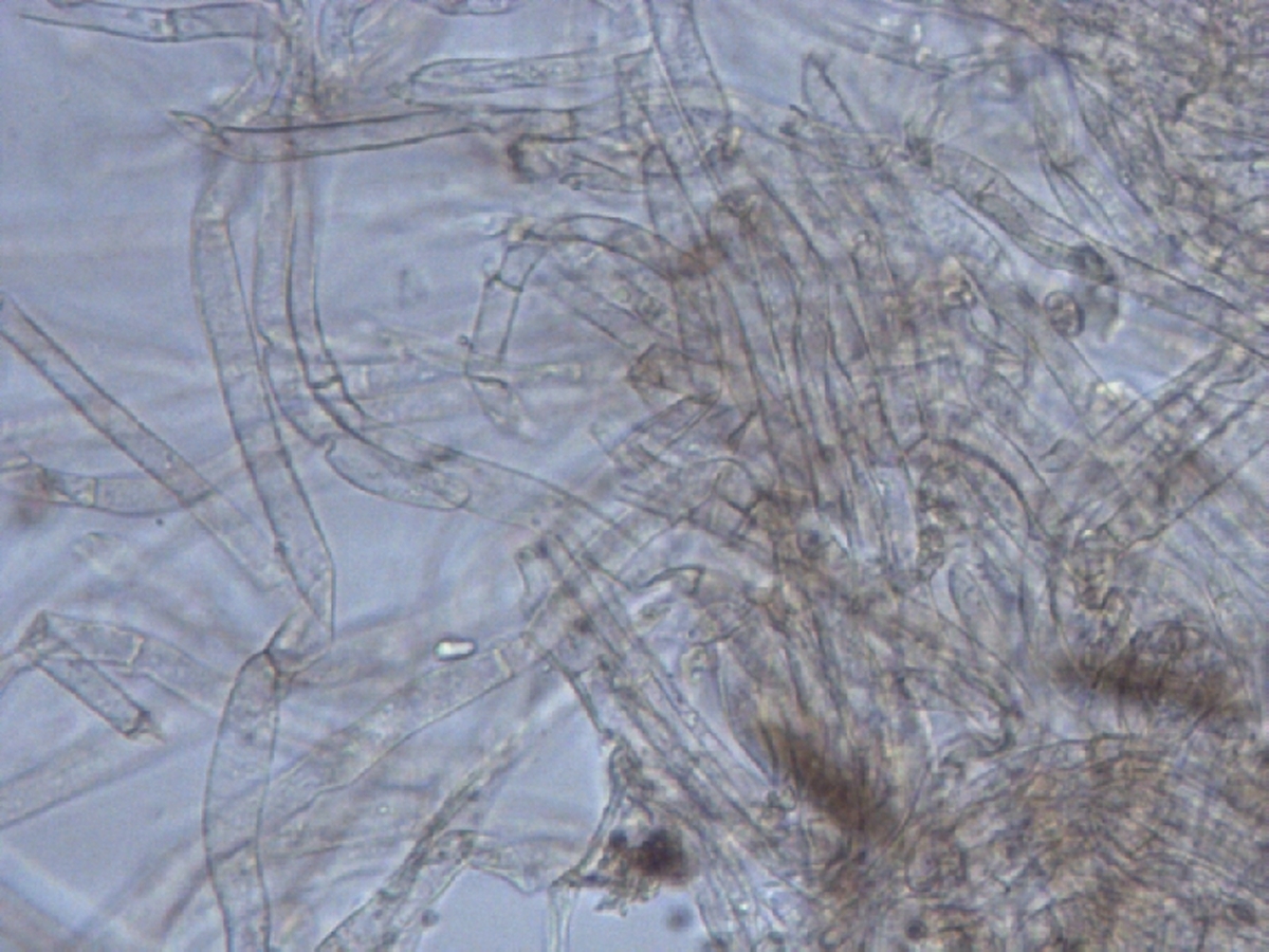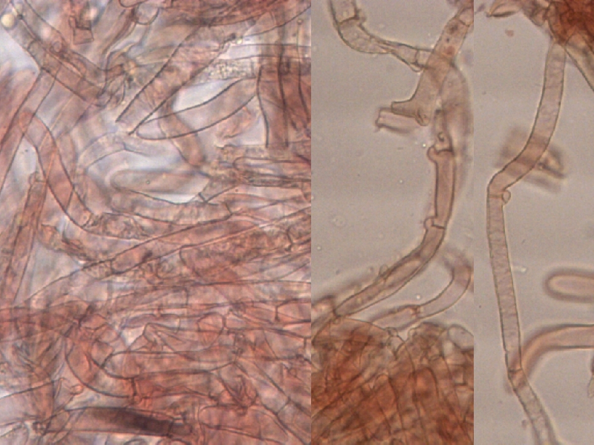 Hutdeckschicht ebenfalls mit inkrustierten Hyphen und zylindrischen abgerundeten Endzellen, Schnallen auch hier häufig: