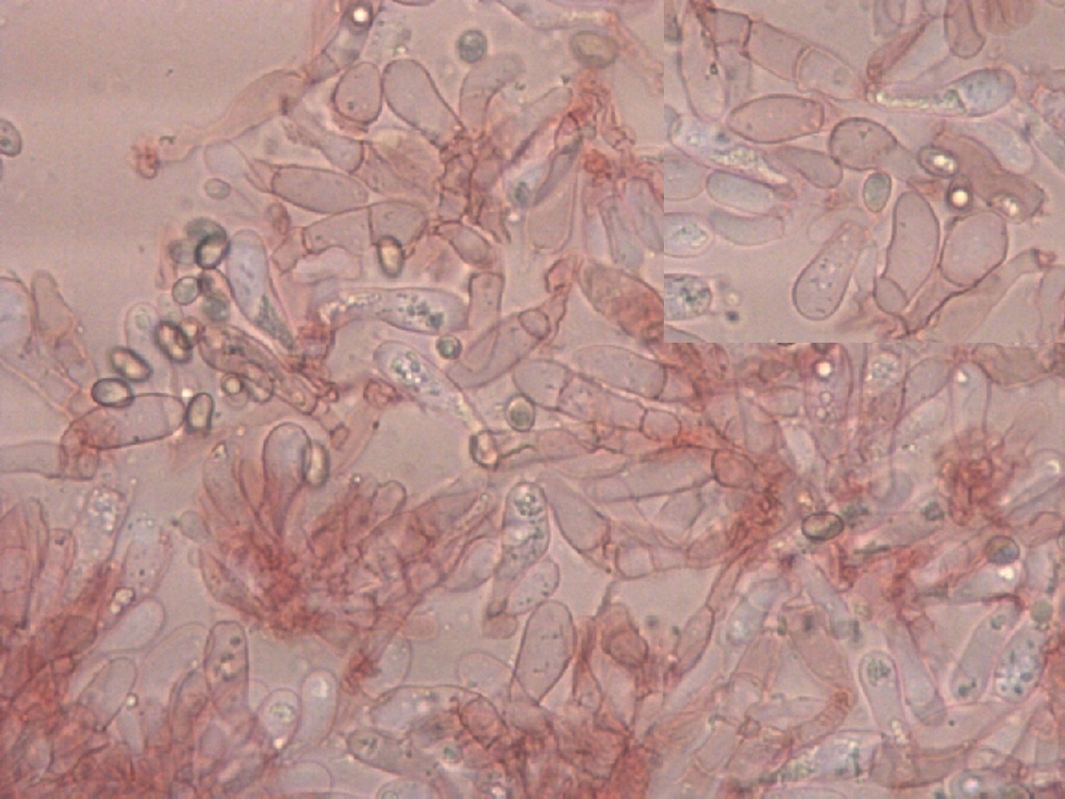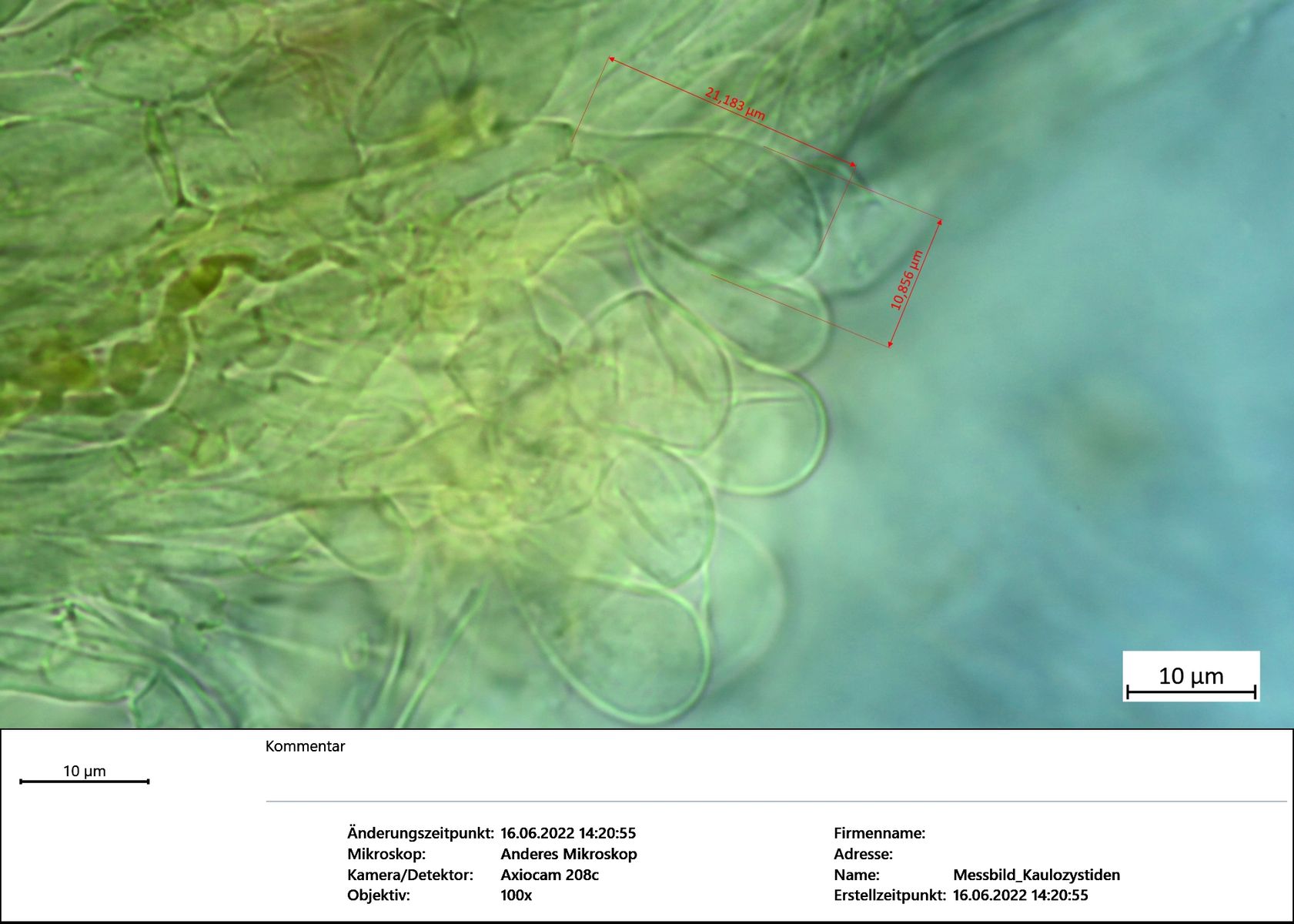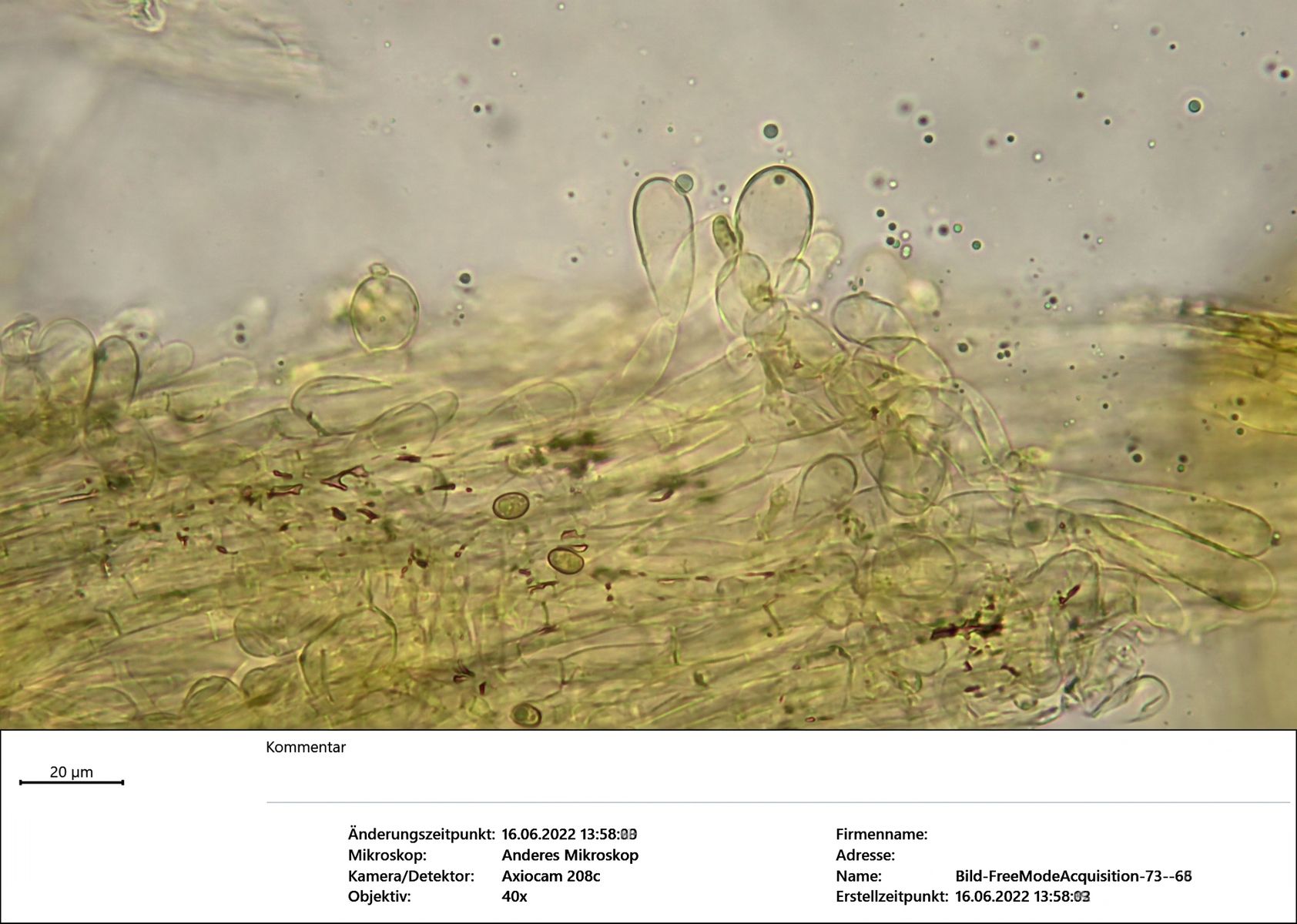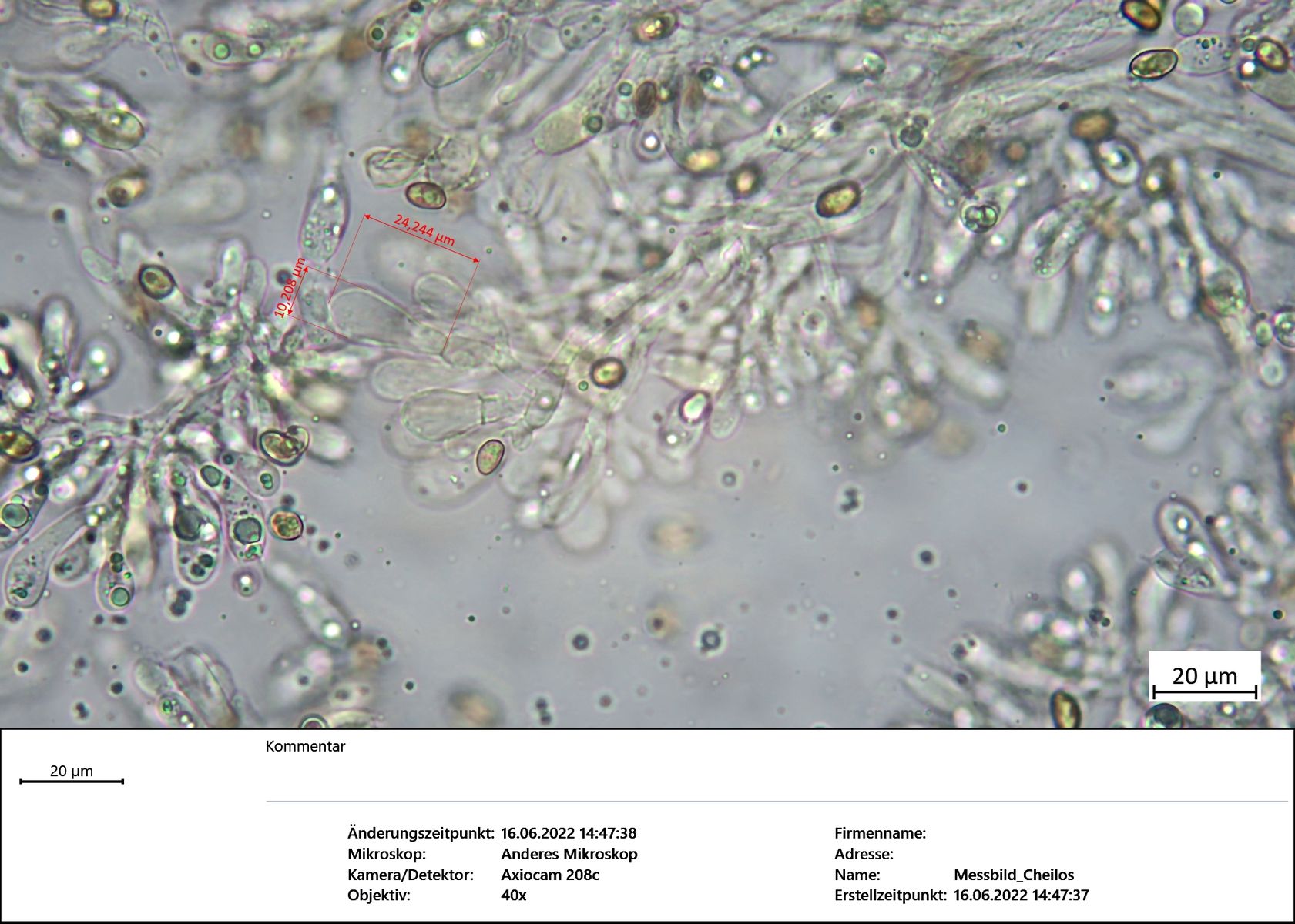 Sporen Länge µm Breite µm Quotient 1 9,21 5,52 1,67 2 8,40 5,30 1,59 3 8,93 5,30 1,68 4 9,20 5,30 1,74 5 10,32 6,27 1,65 6 9,03 5,57 1,62 7 8,40 5,72 1,47 Durchschnitt 9,07 5,57 1,63 Cheilozystiden oft septiert, mitunter mehrfach. Endzellen: Breite um die 10µm, Länge um die 25µm. Mehrere Cheilos von einem "Ast" ausgehend.