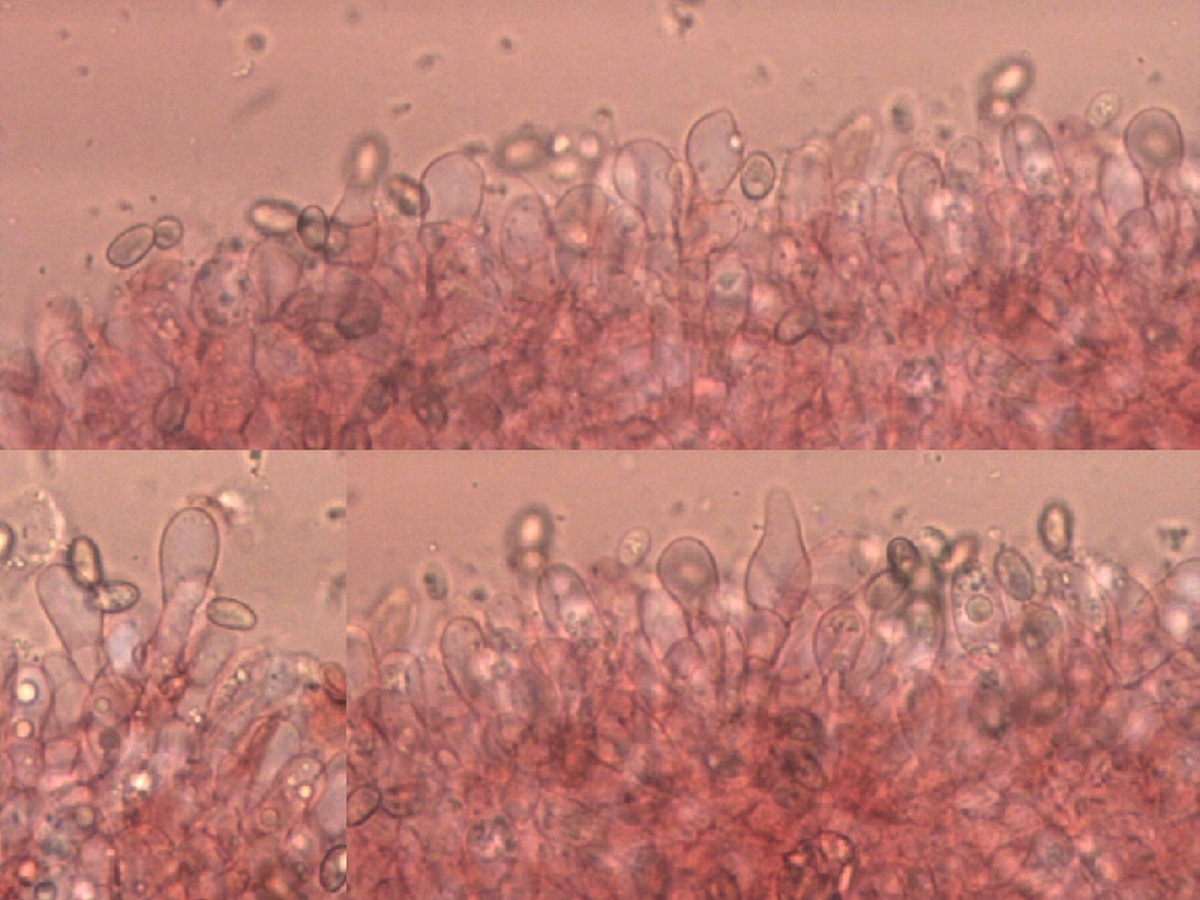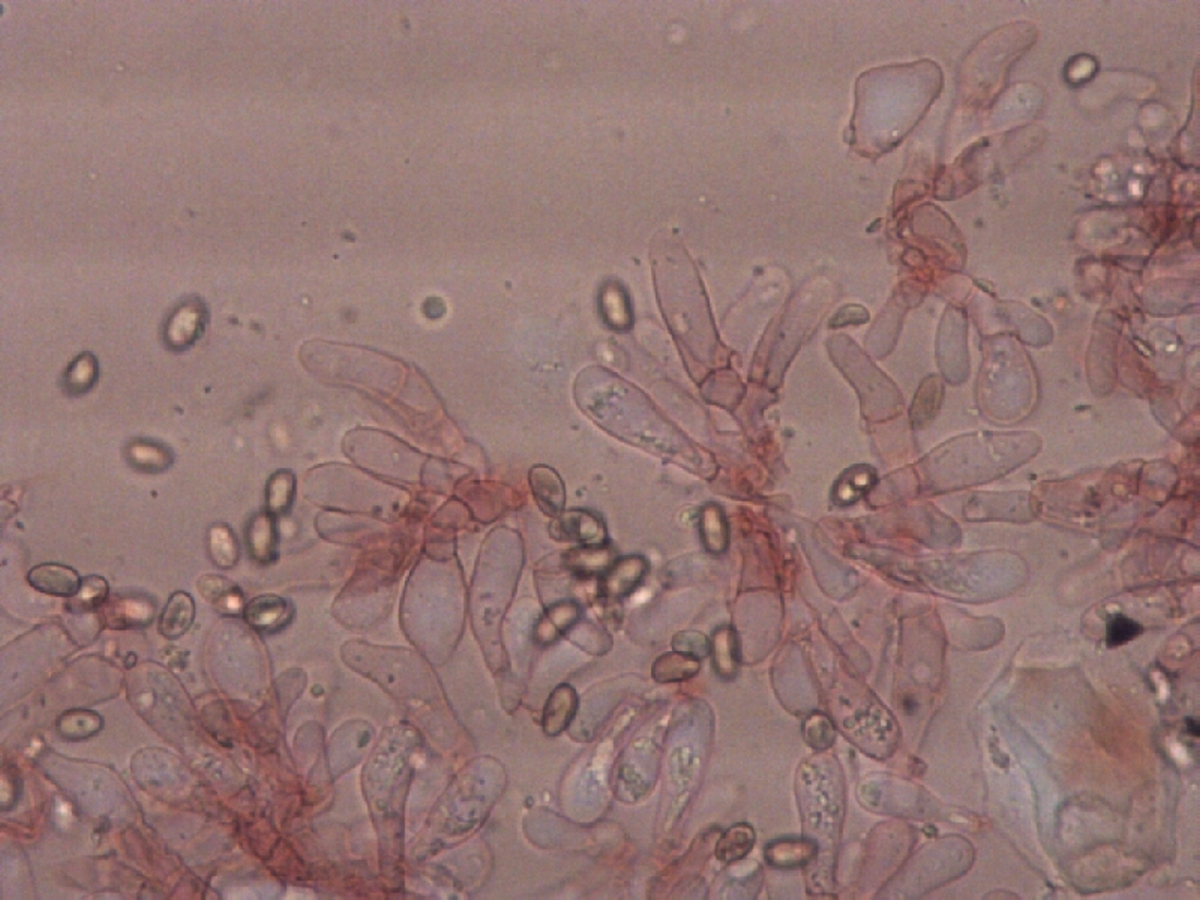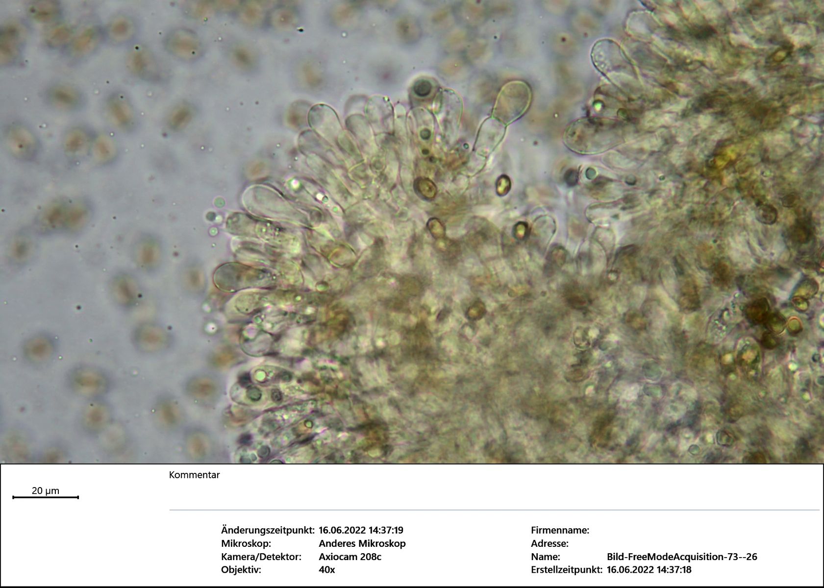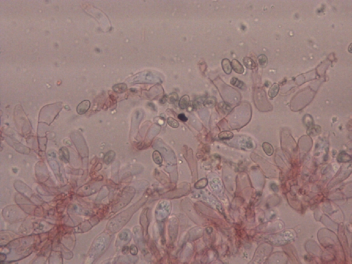 Sporen Länge µm Breite µm Quotient 1 9,21 5,52 1,67 2 8,40 5,30 1,59 3 8,93 5,30 1,68 4 9,20 5,30 1,74 5 10,32 6,27 1,65 6 9,03 5,57 1,62 7 8,40 5,72 1,47 Durchschnitt 9,07 5,57 1,63 Cheilozystiden oft septiert, mitunter mehrfach. Endzellen: Breite um die 10µm, Länge um die 25µm. Mehrere Cheilos von einem "Ast" ausgehend.