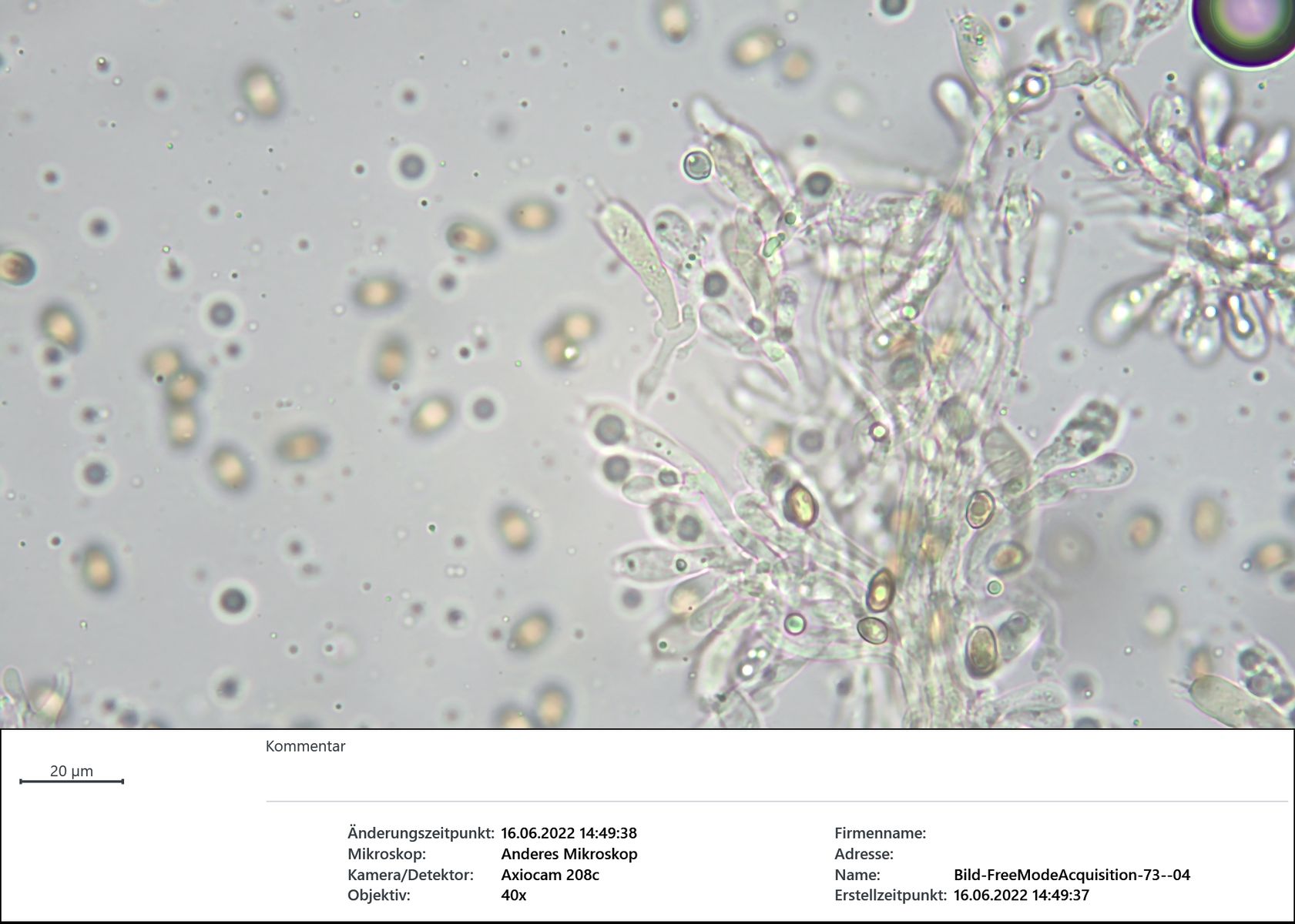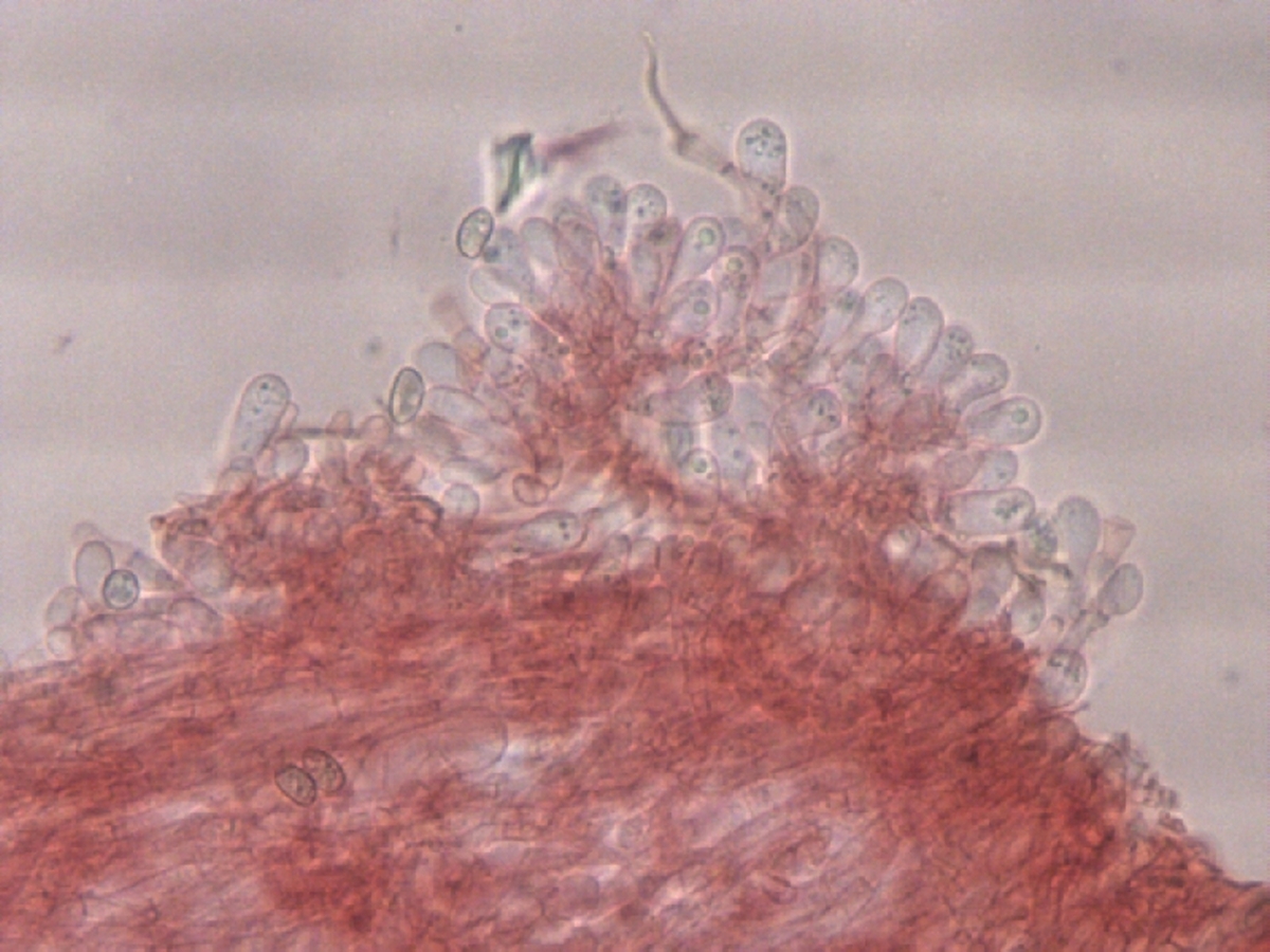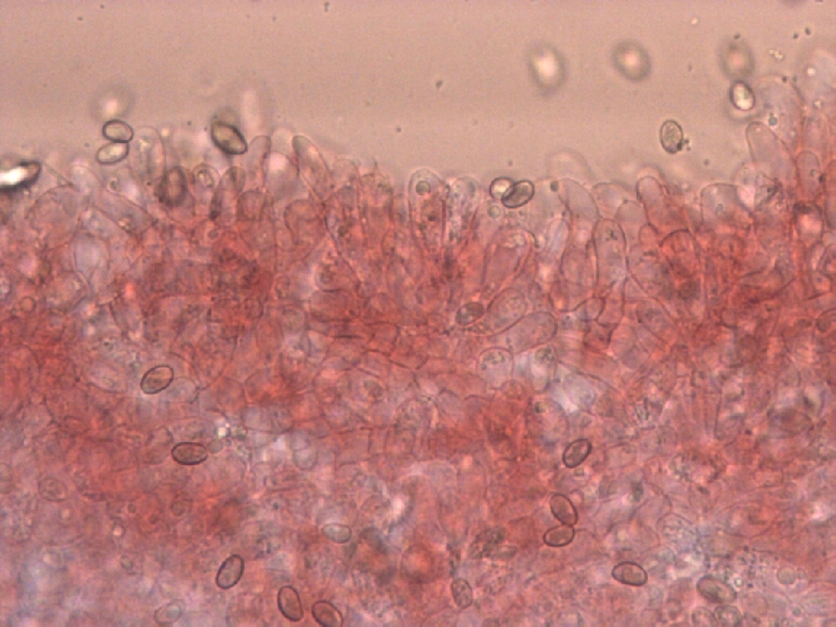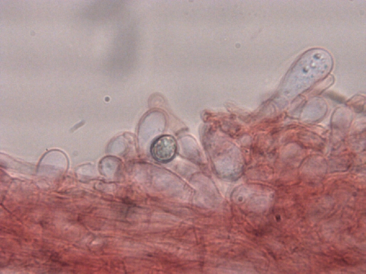 Sporen Länge µm Breite µm Quotient 1 9,21 5,52 1,67 2 8,40 5,30 1,59 3 8,93 5,30 1,68 4 9,20 5,30 1,74 5 10,32 6,27 1,65 6 9,03 5,57 1,62 7 8,40 5,72 1,47 Durchschnitt 9,07 5,57 1,63 Cheilozystiden oft septiert, mitunter mehrfach. Endzellen: Breite um die 10µm, Länge um die 25µm. Mehrere Cheilos von einem "Ast" ausgehend.