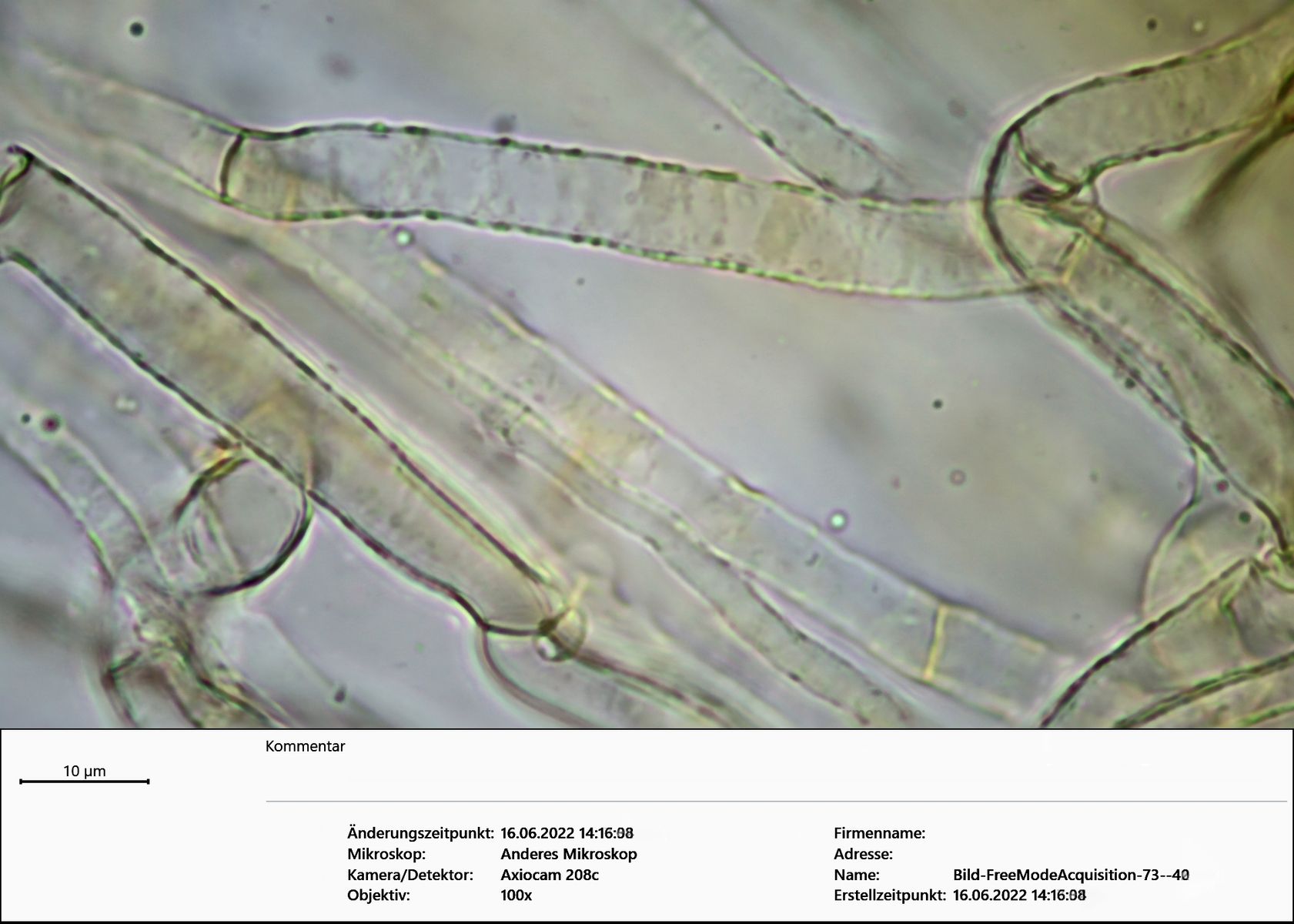 Huthauthyphen bis 6,5 - 8,5 (10) mµ dick, mit deutlichen Inkrustationen und Schnallen