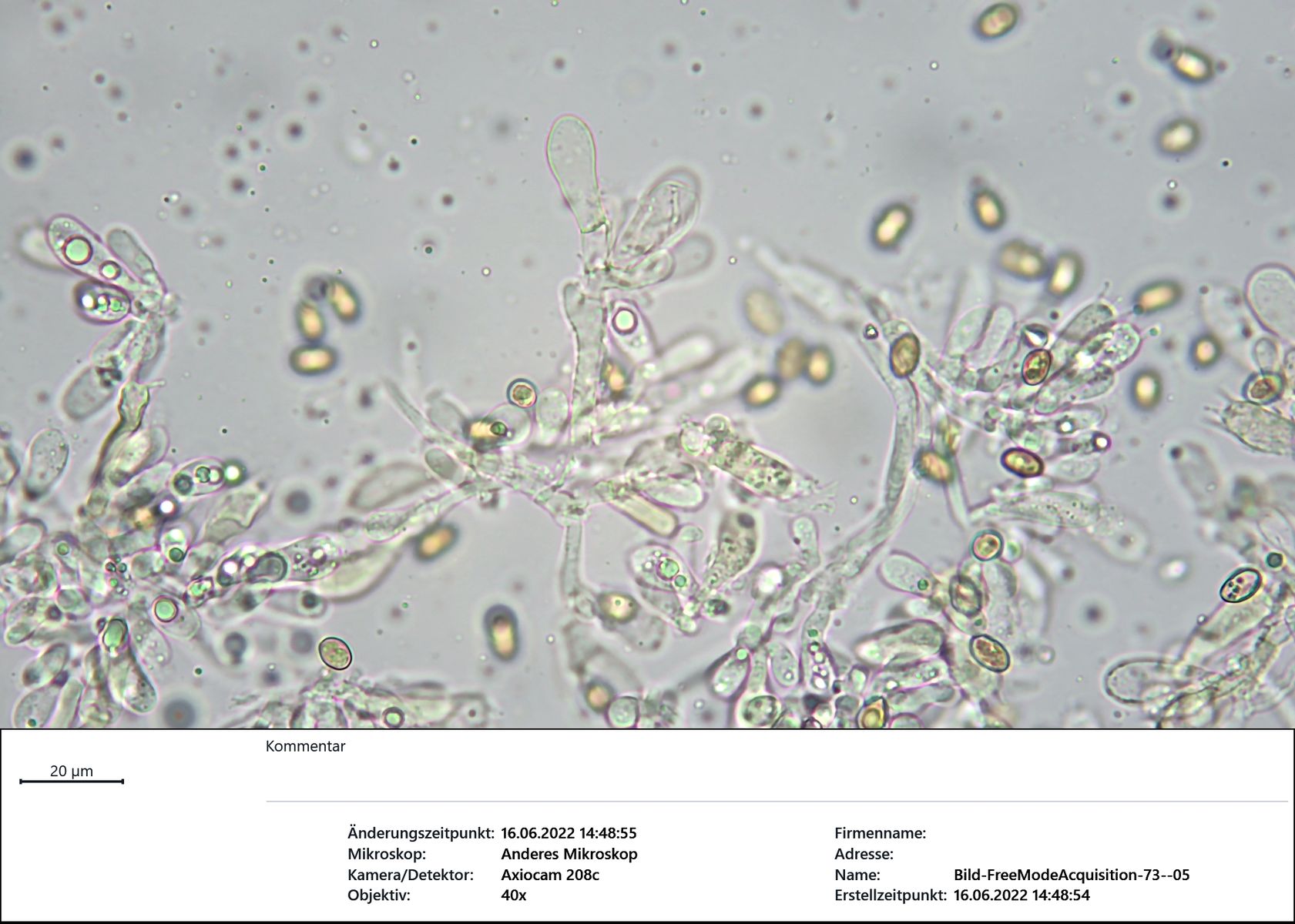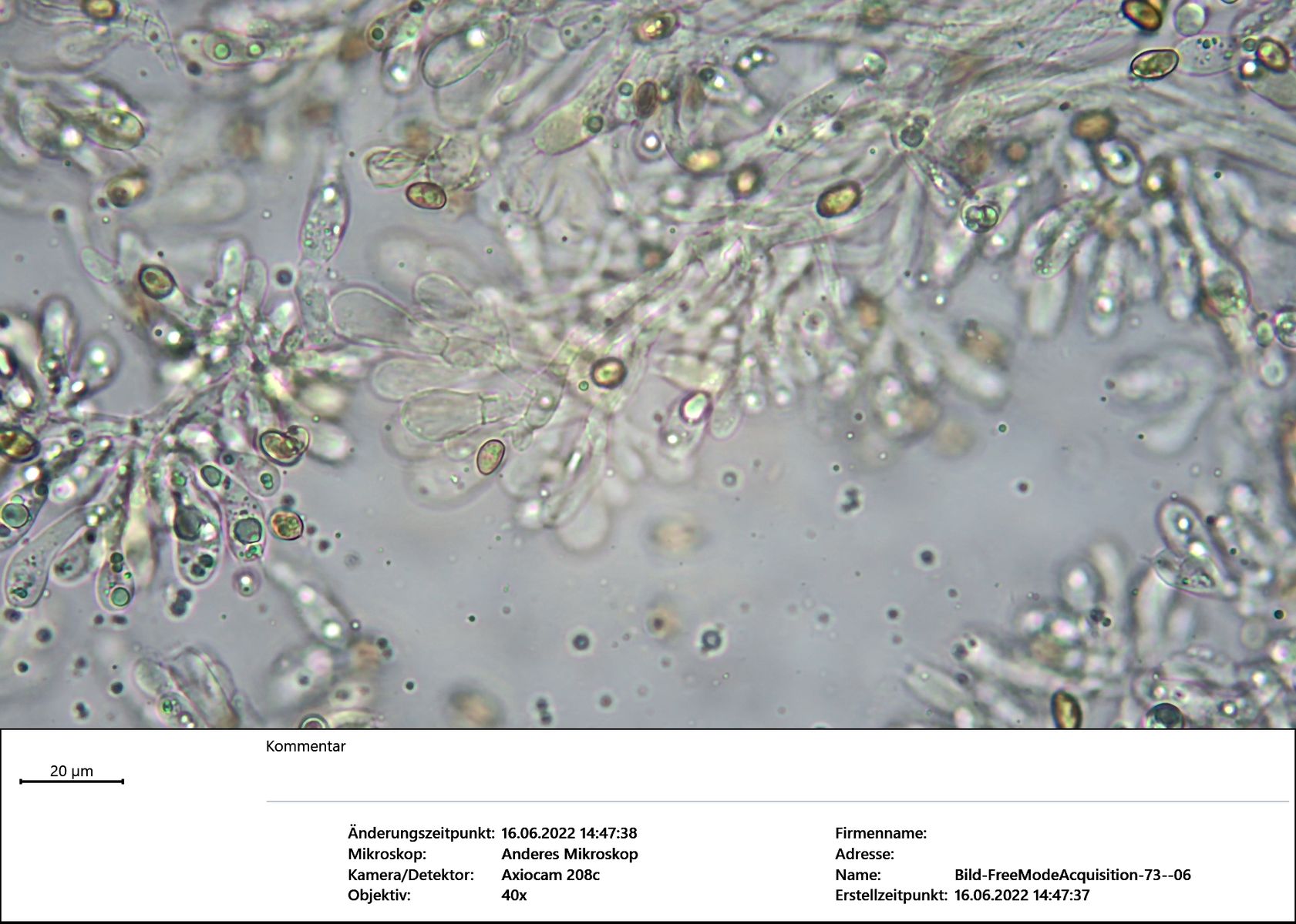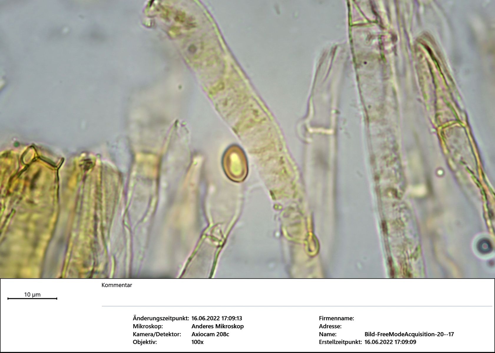Sporen Länge µm Breite µm Quotient 1 9,21 5,52 1,67 2 8,40 5,30 1,59 3 8,93 5,30 1,68 4 9,20 5,30 1,74 5 10,32 6,27 1,65 6 9,03 5,57 1,62 7 8,40 5,72 1,47 Durchschnitt 9,07 5,57 1,63 Cheilozystiden oft septiert, mitunter mehrfach. Endzellen: Breite um die 10µm, Länge um die 25µm. Mehrere Cheilos von einem "Ast" ausgehend.