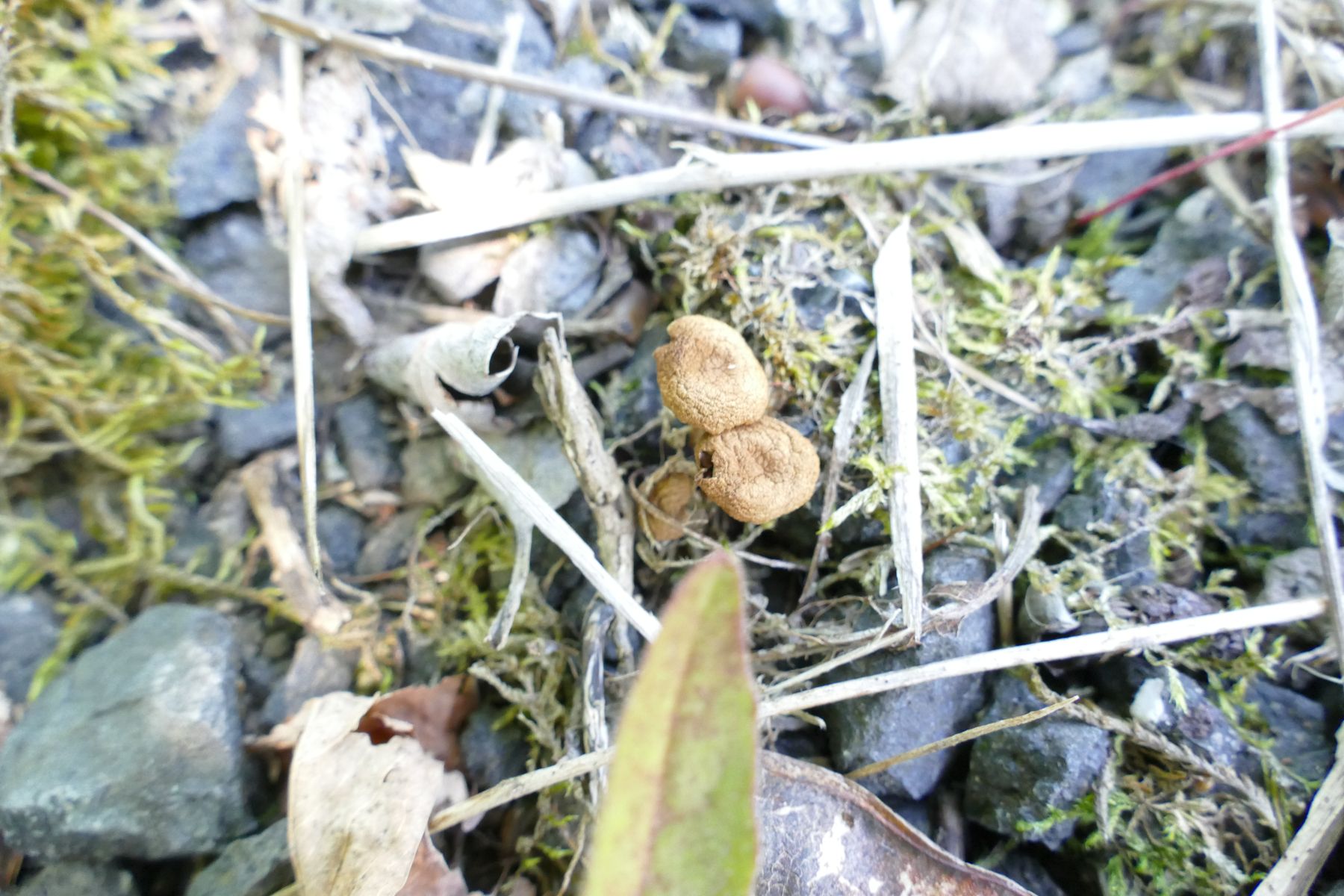 Der Fundort hier aber liegt am Parkplatz, der den Einstieg ins Wallbachtal markiert. Der Fundort dort zeigt sich steinig und geschottert. Das kann durchaus grauer Kalksteinsplitt sein. Das müsste ich aber nochmal genau verifizieren. Auf folgendem Bild (mit vertrockneten Fruchtkörpern des Pilzes) kann man das einigermaßen erkennen: