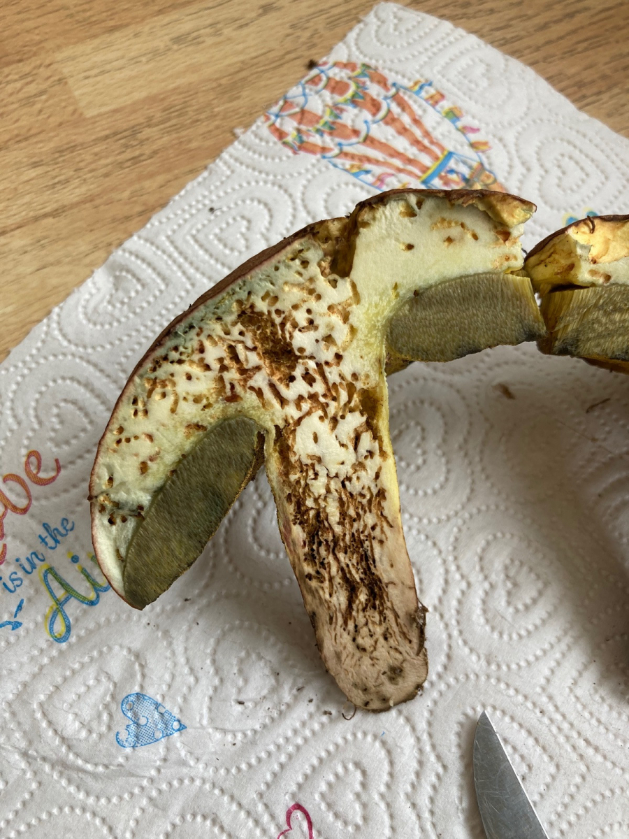Kann das nicht auch ein etwas verblasster Butyriboletus fuscoroseus (Blauender Königsröhrling) sein? Weil auch wenn der Stiel zwar reichlich Madenschaden hat, ist da schon so rosagraues Stielfleisch erkennbar, und in der Huthaut ist auch noch ganz gut fleischrosa Färbung zu erkennen?