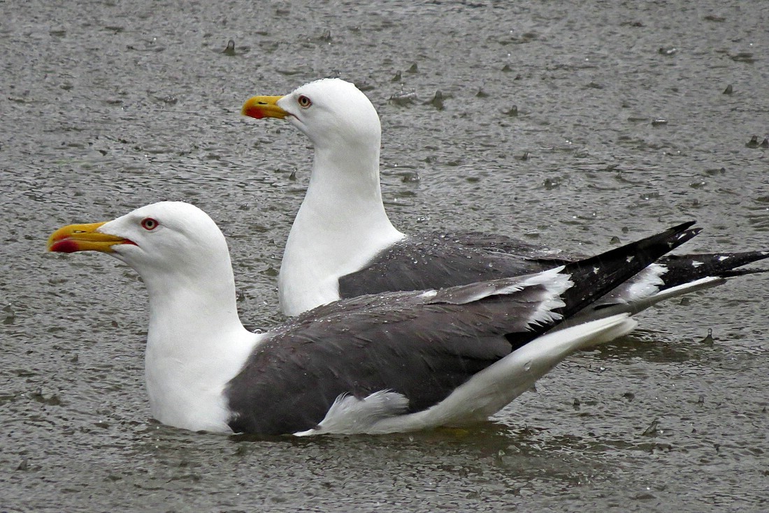 Mantelmöwen (Larus marinus) im Regen. Die größten europäischen Möwen erreichen immerhin eine Flügelspannweite bis 1,70 Meter.