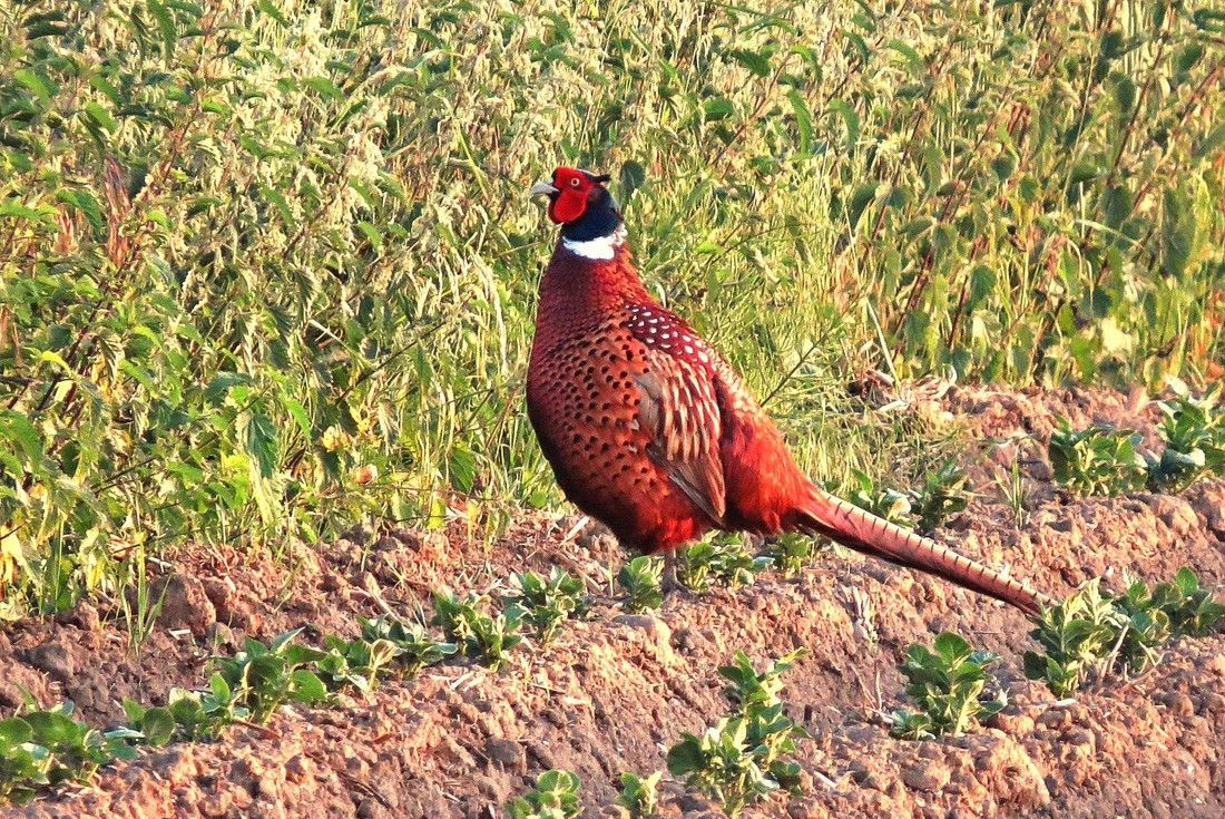 Einige Beobachtungen, die mir vom Deck gelangen. Jagdfasan (Phasianus colchicus) im Abendrot.