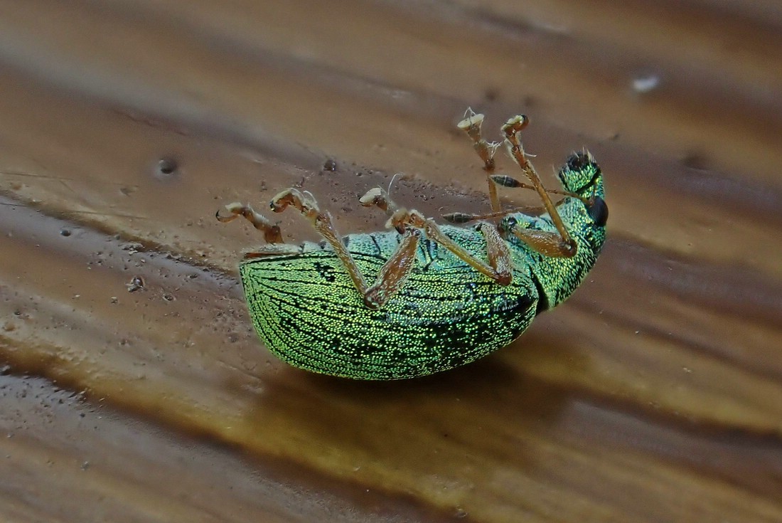 Ein winziger Grünrüssler (Eusomus ovulum) in Not? Nicht wirklich. Sekunder später stand er schon wieder auf seinen Füßen und war kurz darauf auf und davon.