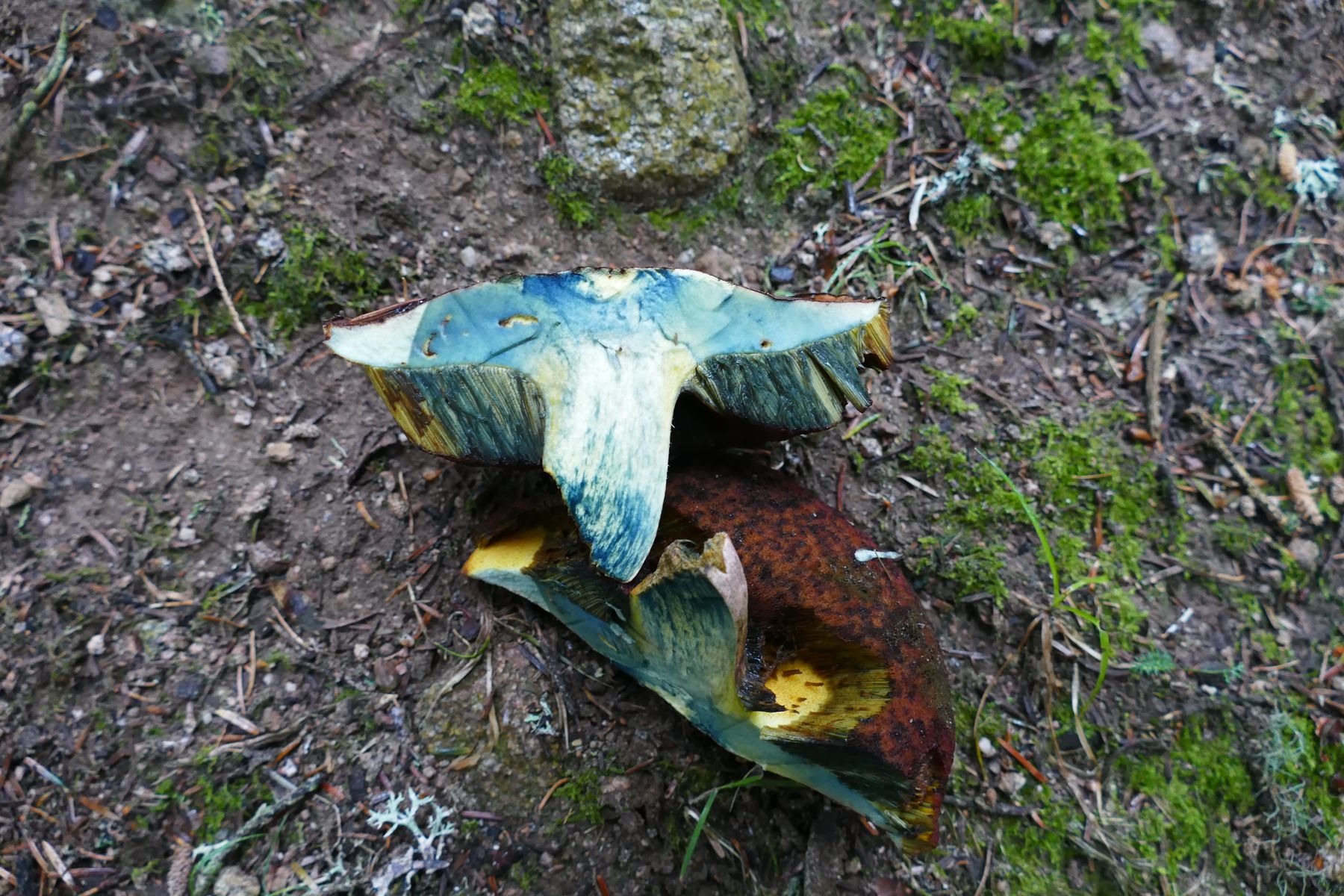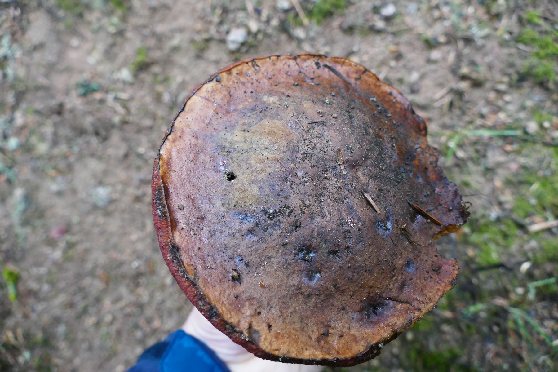 Darunter dieser klassische, sehr buntn Pilz mit Hut in Rot-Gelb-Blau, den offenbar kurz zuvor jemand ausgerissen oder umgetreten hatte. ![]()