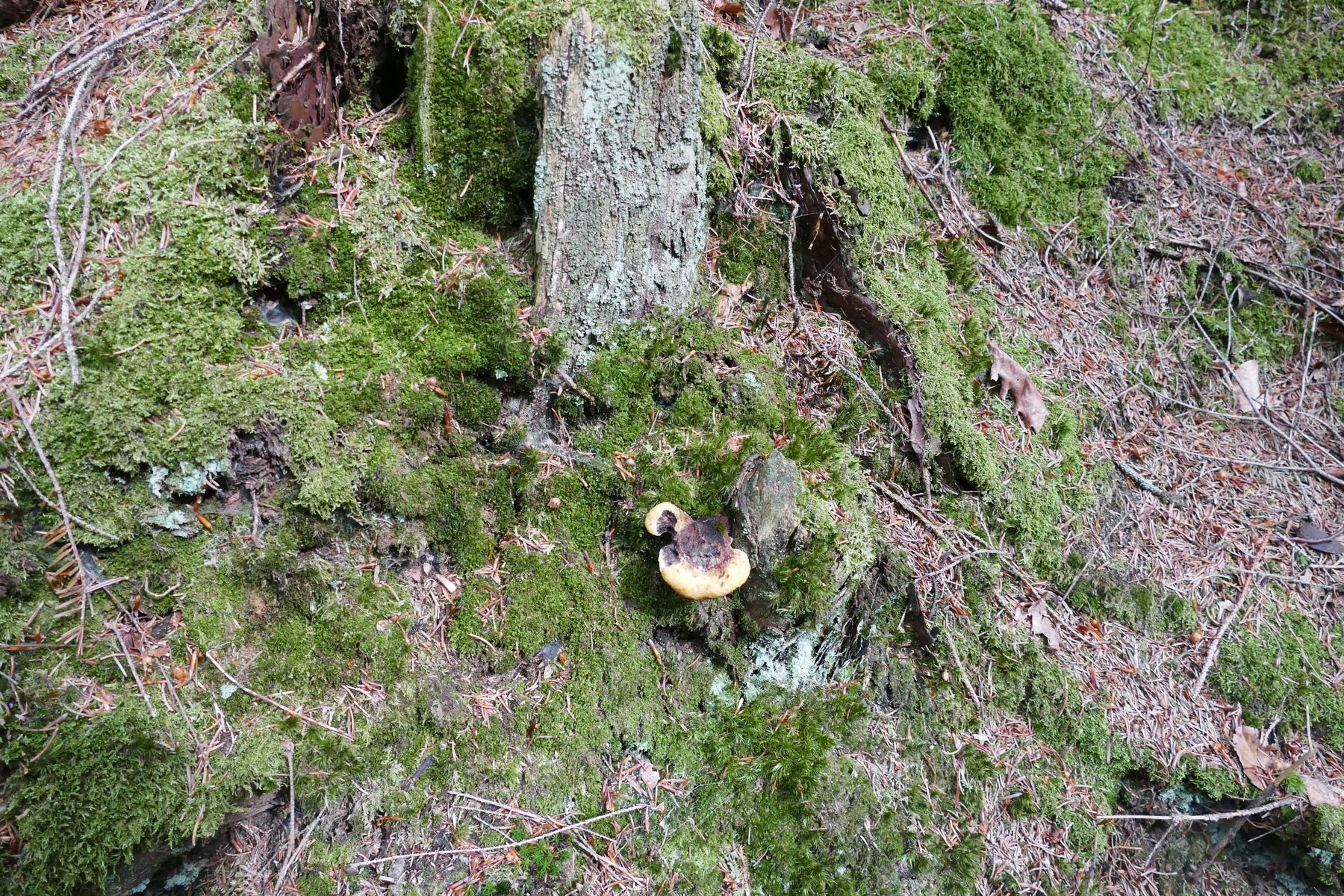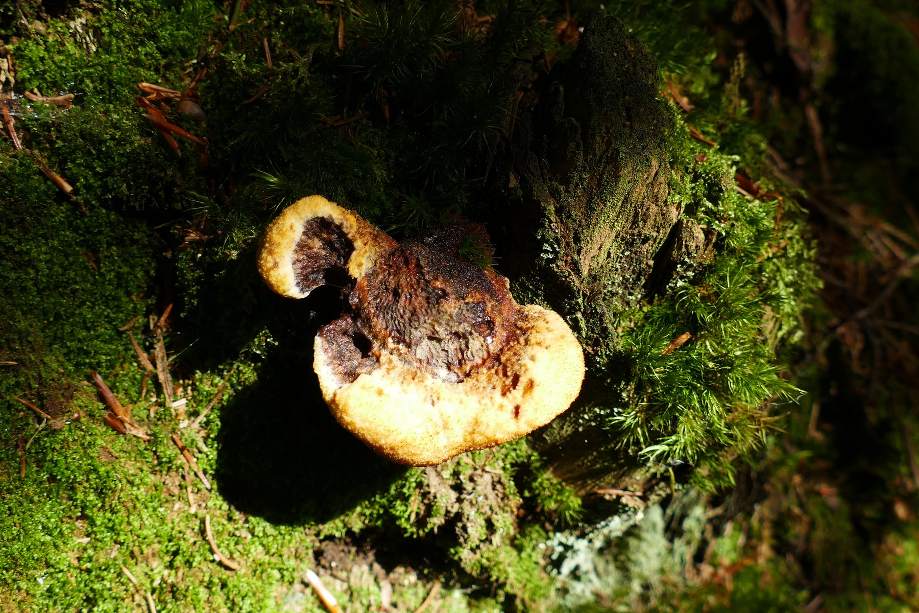 Ansonsten ein Porlingsfund (Porlinge mag ich!) am Fichtenstumpf, den ich für einen kleinen Phaeolus schweinitzii (Kiefernbraunporling) halten würde.