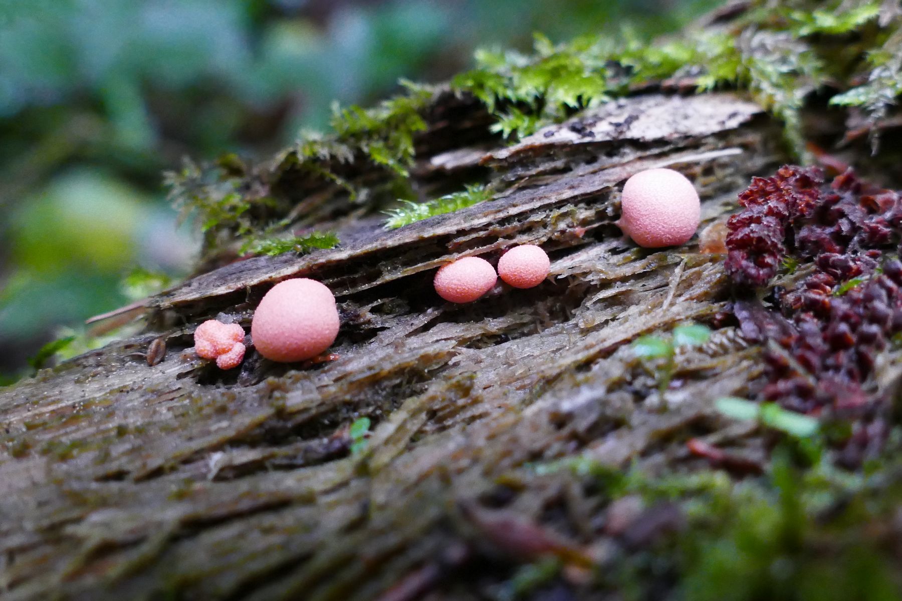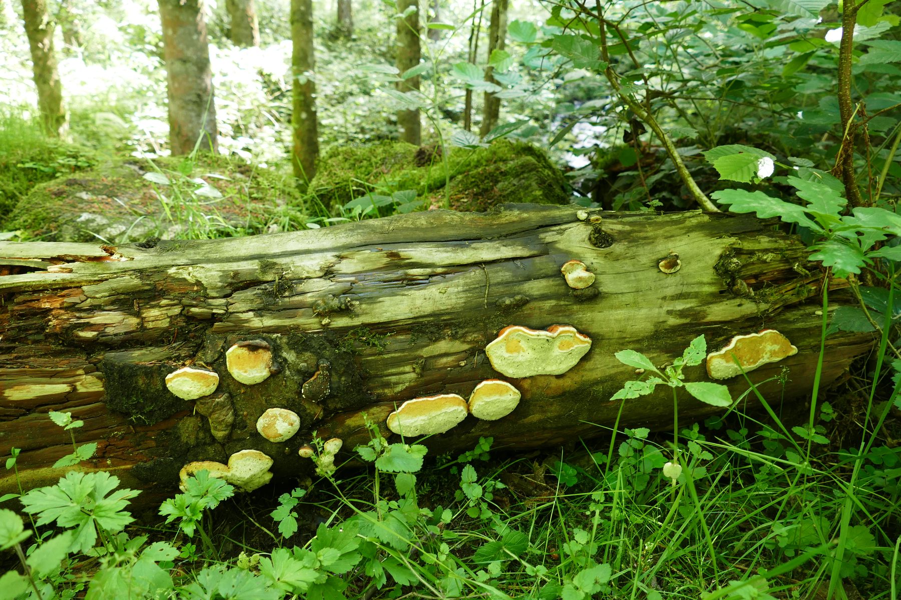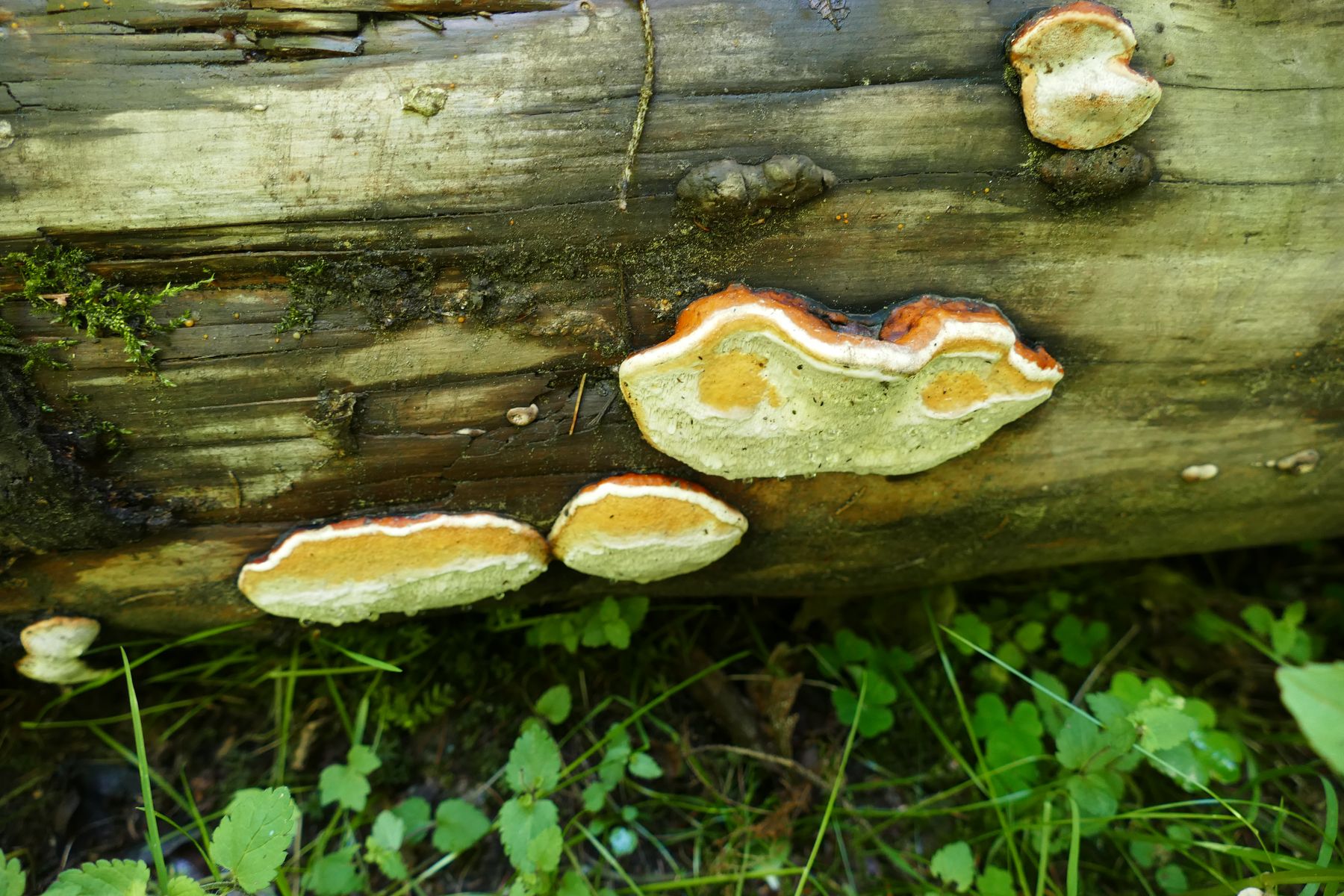 Noch eine hübsche Gruppe Porlinge an einem liegendem Baumstamm, trotz der eher ungewöhnlichen Wuchsform würde ich hier Formitopsis pinicola sehen:
