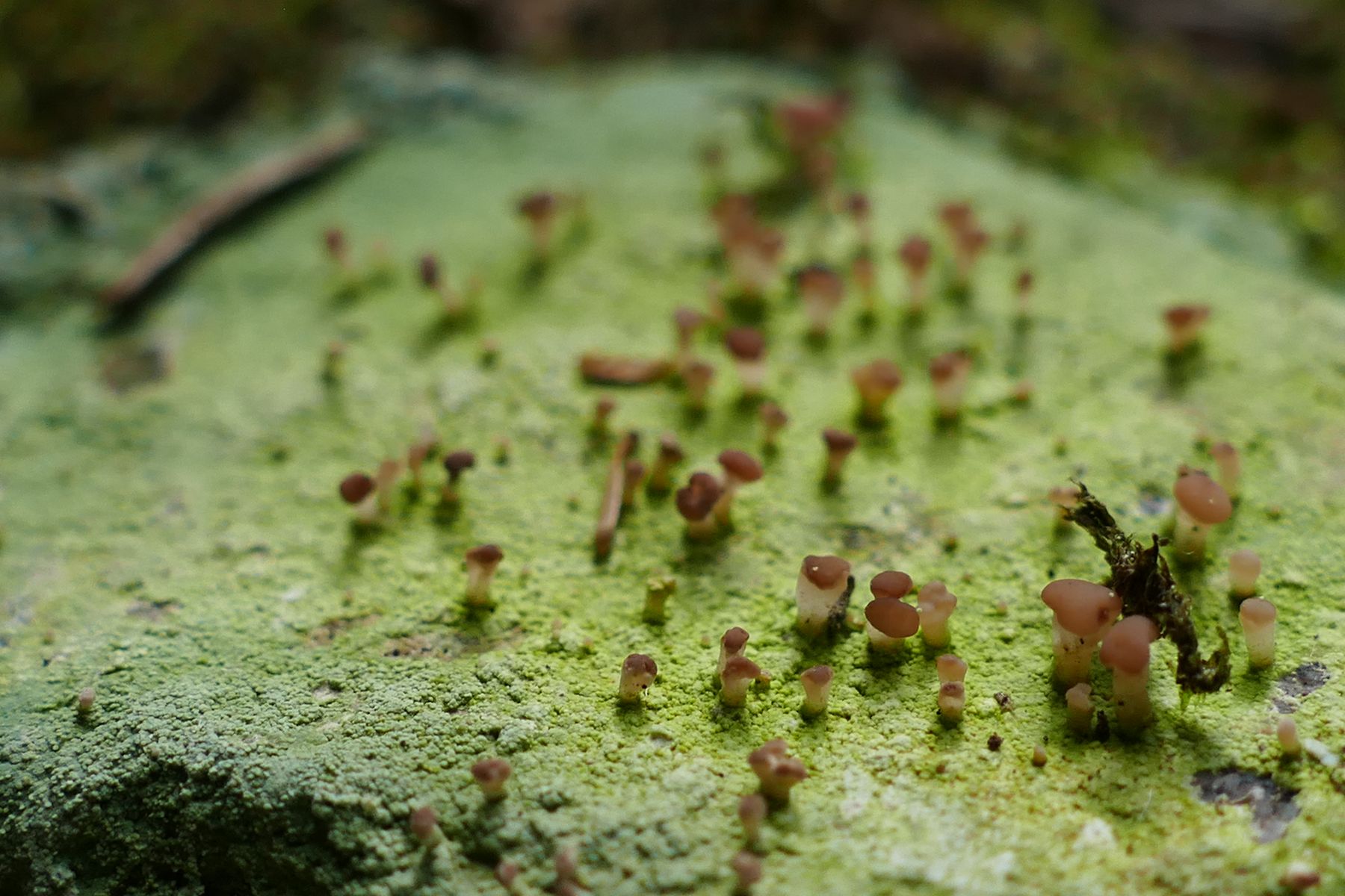 Das hier sieht fast aus wie Pilzchen, es sind aber nur die niedlichen Fruchtkörper von Baeomyces rufus, der Braunen Köpfchenflechte: