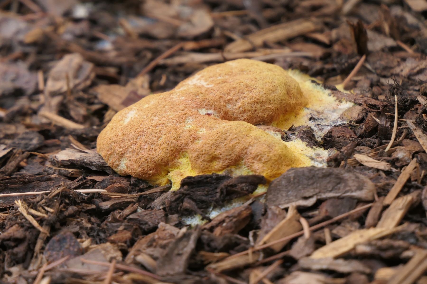 das sollte Fuligo rufa sein, eine im trockenen heißen Sommer recht häufige Art auf Totholz-Resten und anderen Substraten.