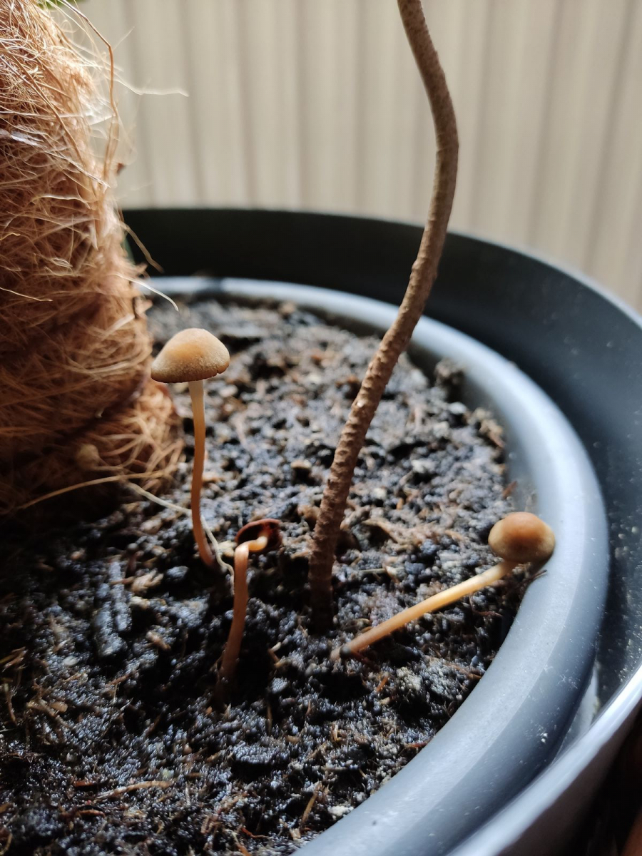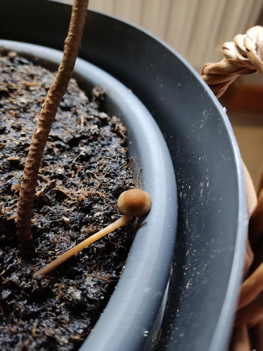 Bei so kleinen Braunen in Blumemerde handelt es sich häufig um Samthäubchen (Conocybe)