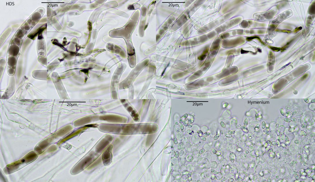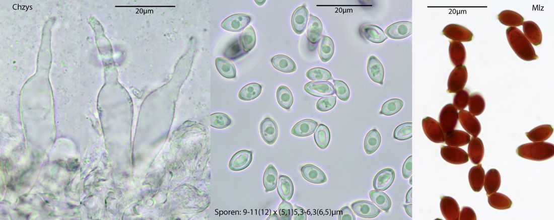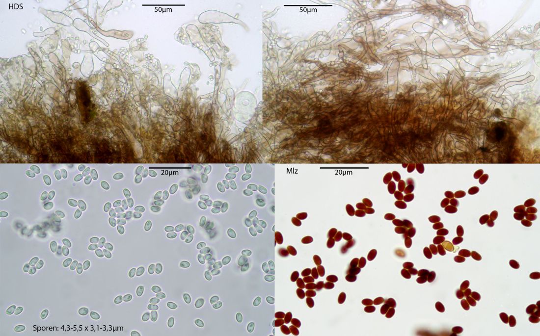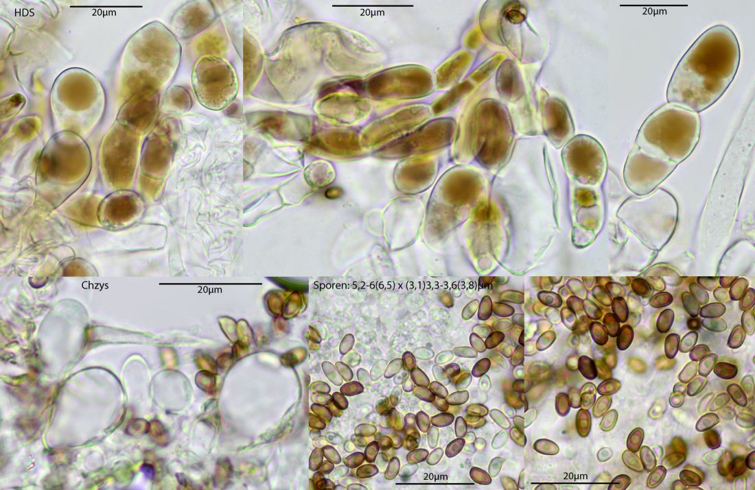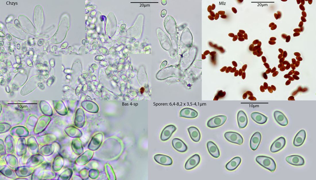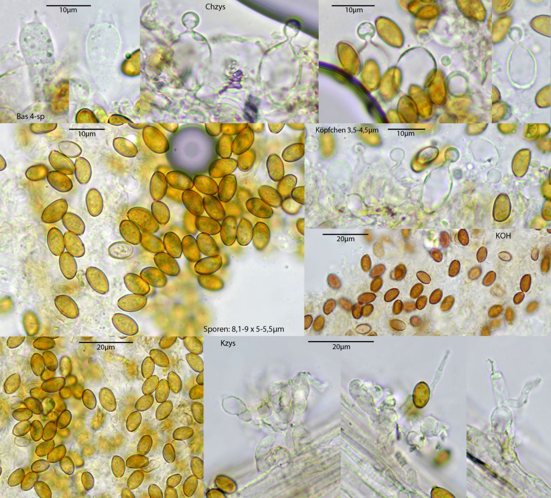 Der Typus dieser Art stammt aus den Gewächshäusern von Bayreuth. Hier also wieder ein neuer Standort, bei uns immer in Warmhäusern. Aus dem Freiland nicht bekannt. Mikroskopisch gibt es hier keine kopfigen Kaulozystiden, dazu recht breite Sporen unter 10 µm, Cheilozystiden-Köpfchen klein, unter 5 µm. Makroskopisch schwärzt diese Art beim Trocknen, auch frisch kann das manchmal deutlich ausgeprägt sein, hier sieht man es nicht wirklich deutlich. Es gab im Haus weitere Conocybe-Exemplare, aber da kam ich nicht ohne weiteres ran, das mach ich dann beim nächsten Besuch.