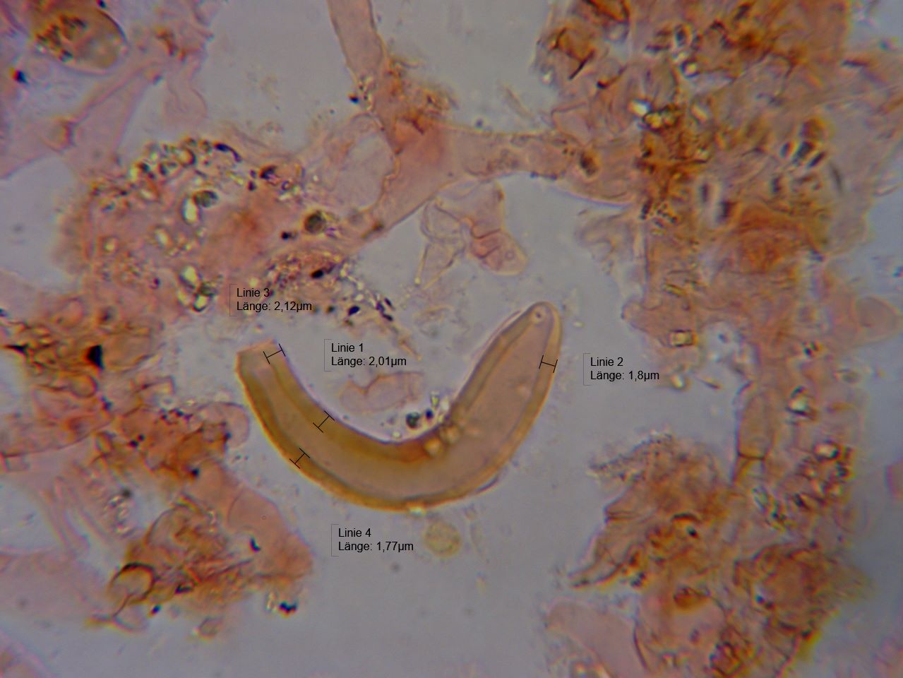 Bei diesem ließen sich nun zwei Velumarten feststellen, dünnwandige, inkrustierte Hyphen mit Auswüchsen und dickwandige, etwas gelblich gefärbte Elemente, die zylindrisch sind