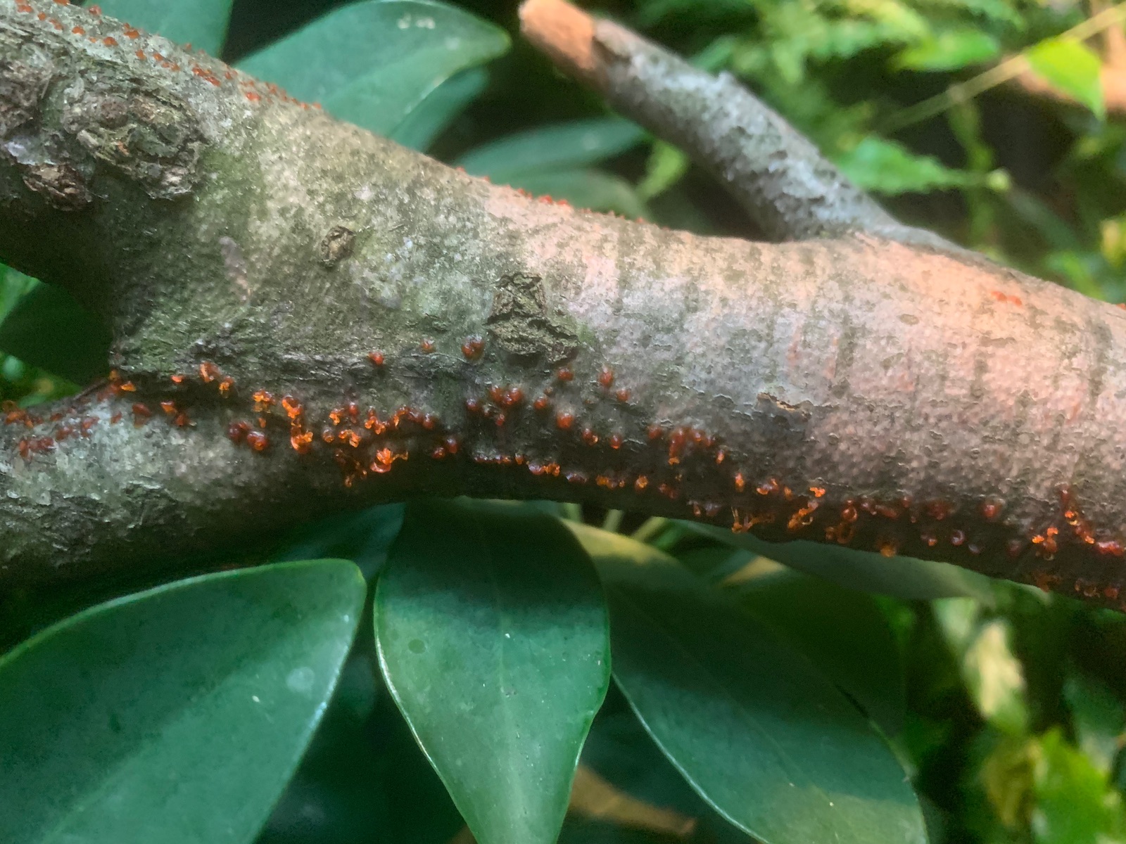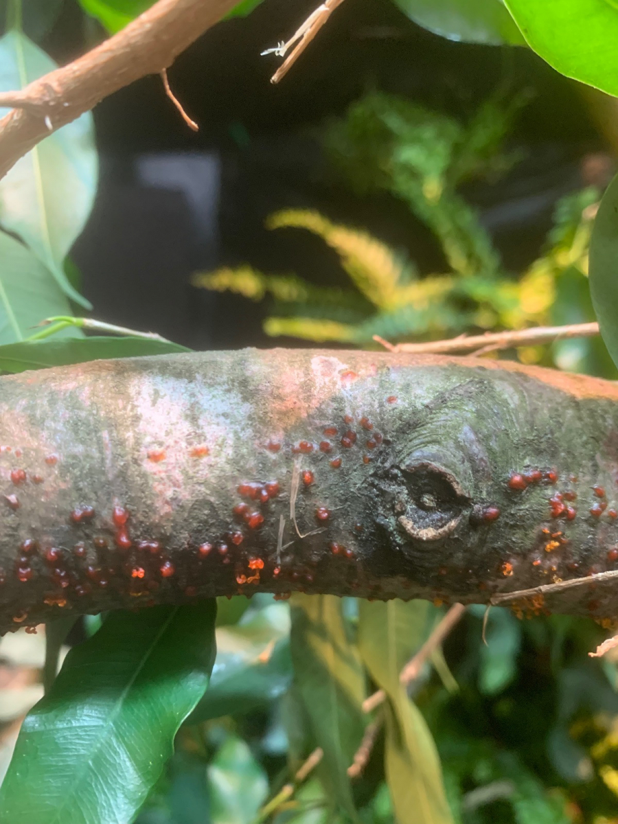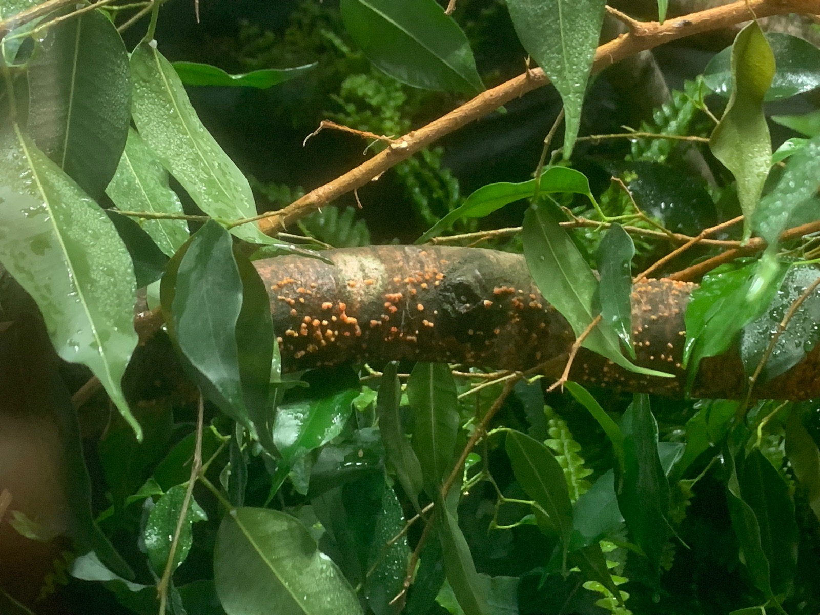 Für euch ist das sicher ein Leichtes: Ich habe relativ frische Buchenäste (lagen aber schon am Boden) in mein Terrarium verbracht, wo sich jetzt bei angenehmen 25-30°C und relativ hoher Luftfeuchtigkeit eine Spezies aus eurem Lieblings-Reich scheinbar sehr wohlfühlt. Aber welche?