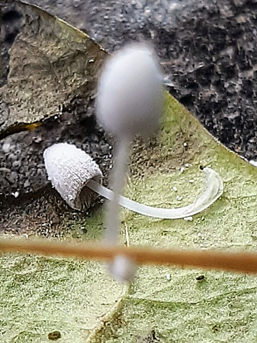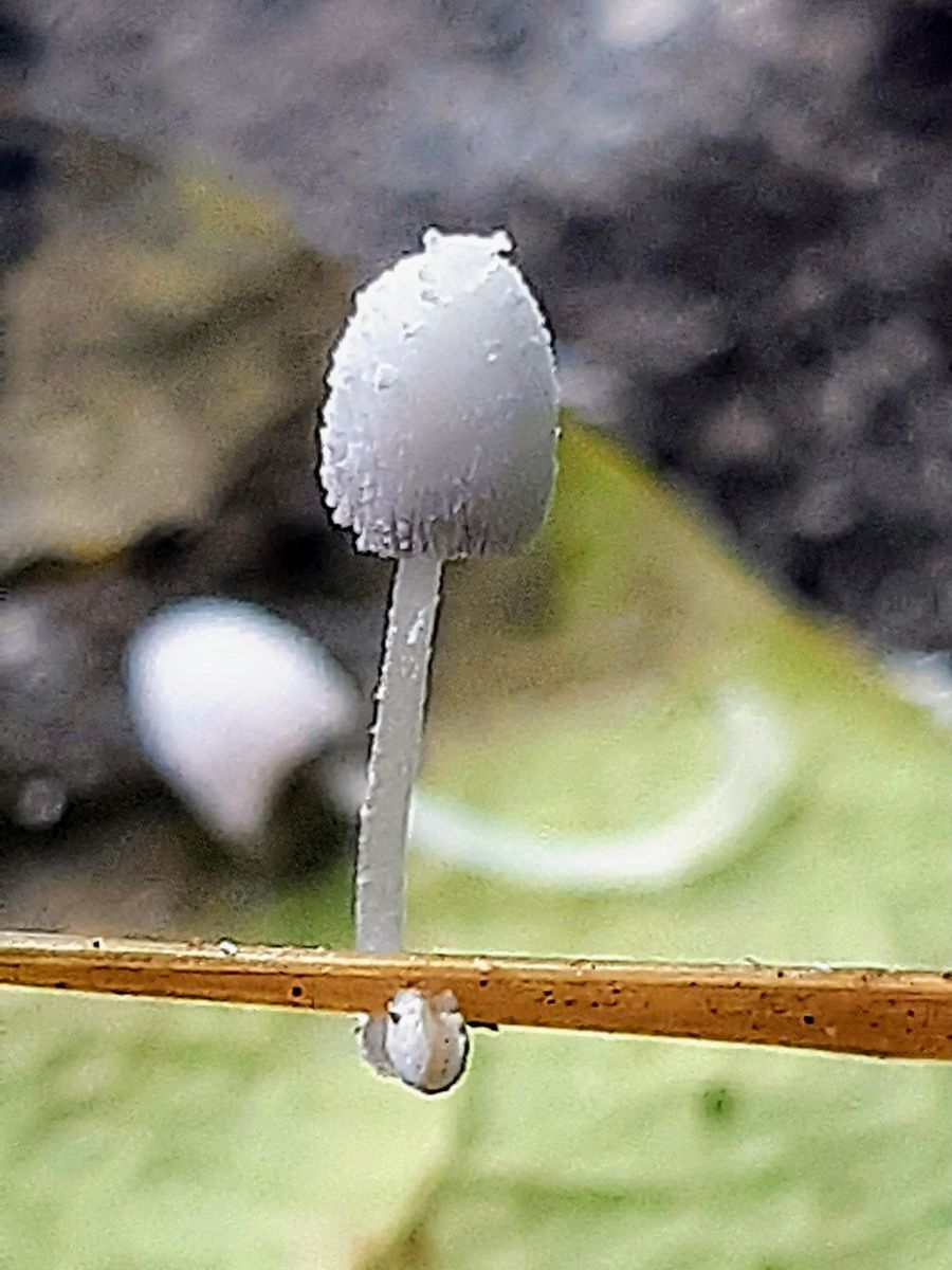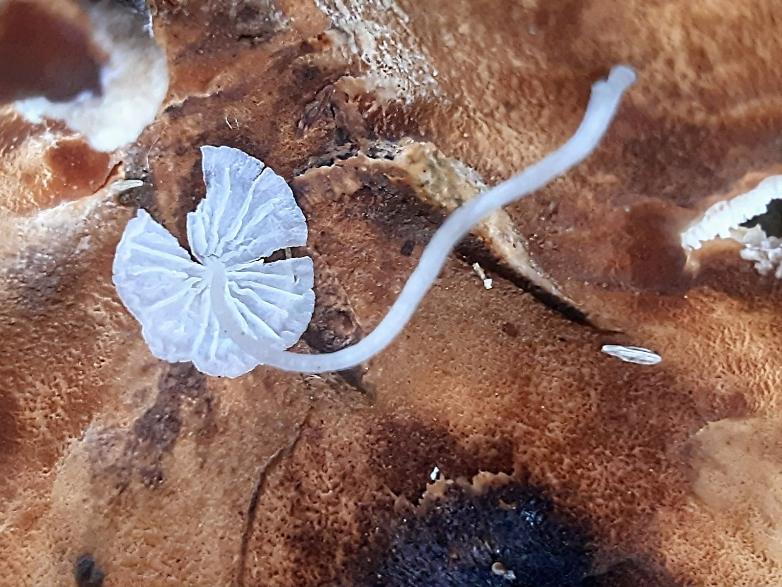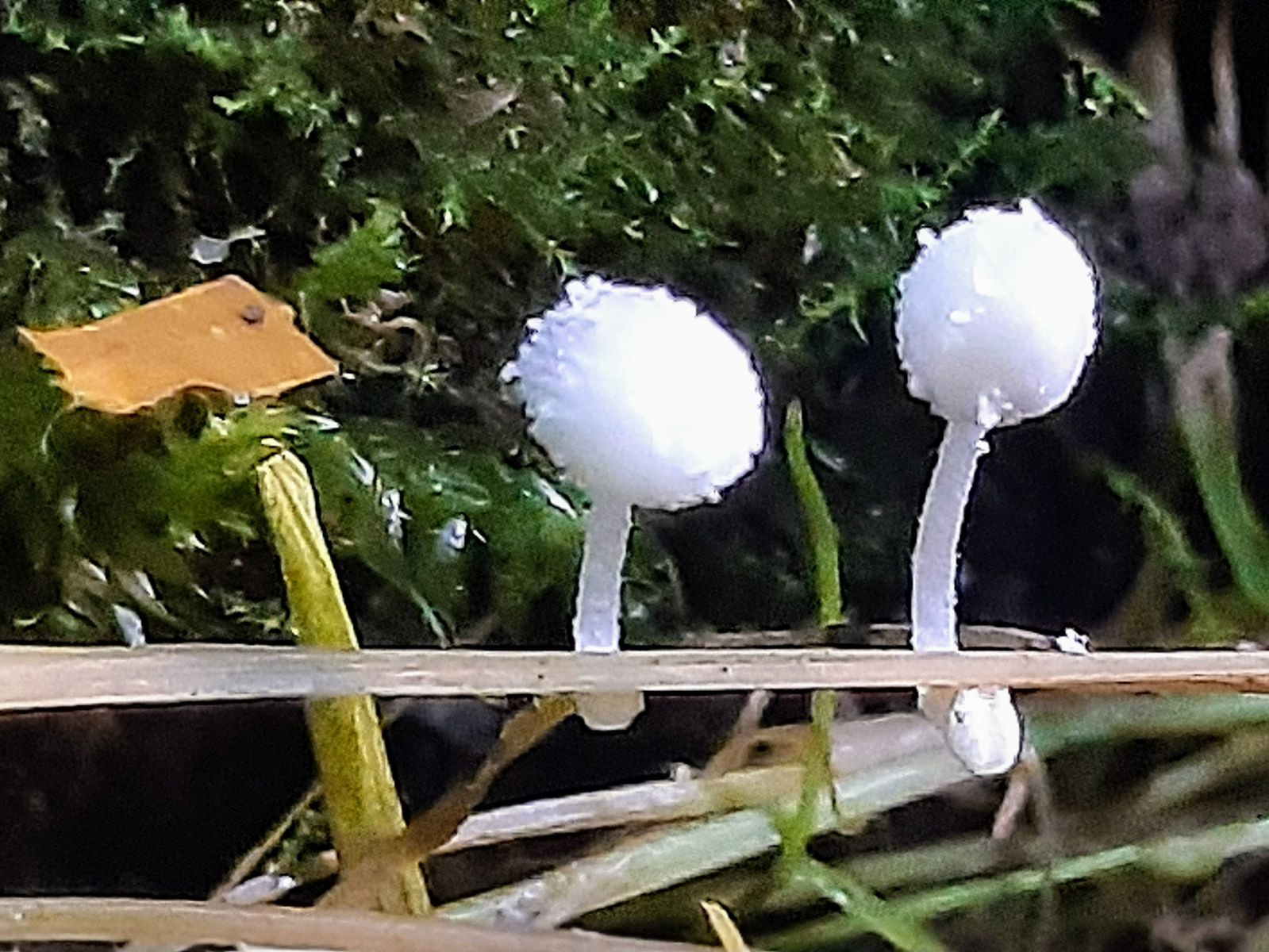 Links davon noch kleinere Winzlinge, scheinbar nicht auf Holz wachsend. Gesamthöhe circa zwei Millimeter.