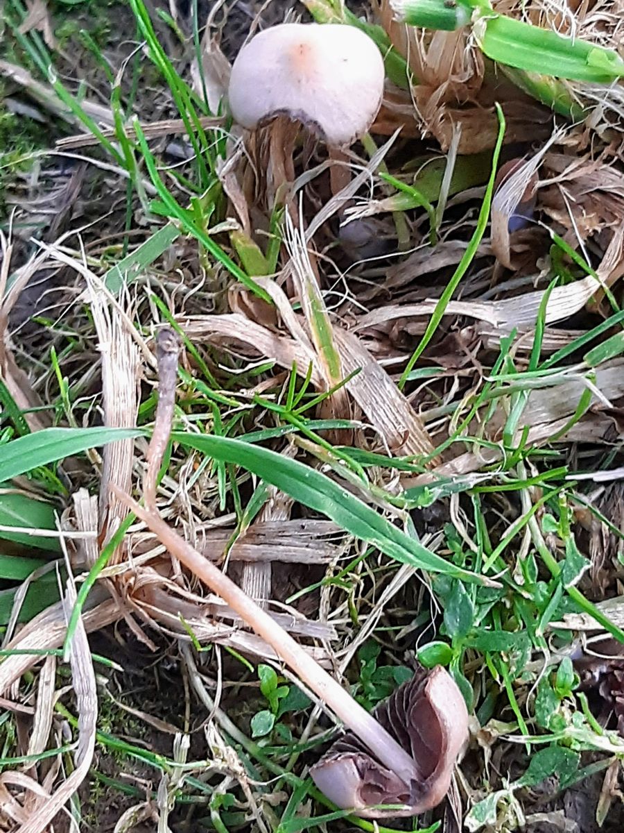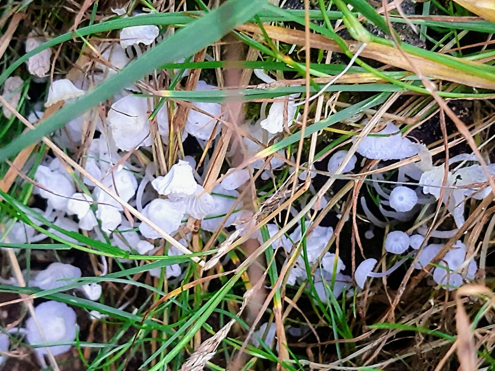 Gleich dahinter, auch auf dem morschen Holz wachsend, einige Winzlinge im Gras. Die größten etwa acht bis zehn Millimeter Hutdurchmesser.